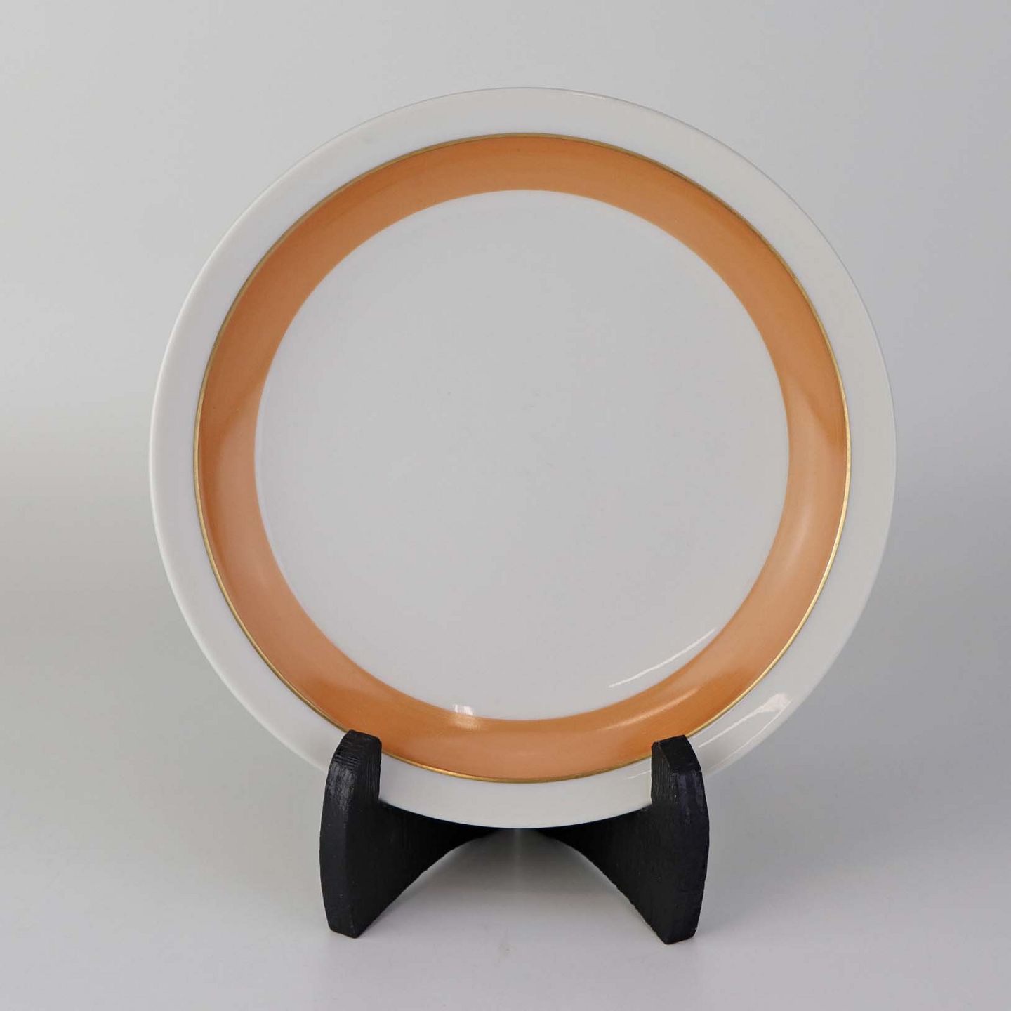 Service i glat hvidt porcelæn med orangerød dekoration over glasuren og guldkant