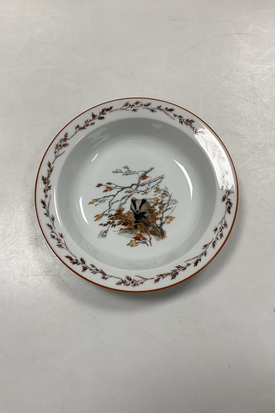 Mads Stage Jagtstellet Dyb Tallerken. Producent: Seltmann Weiden. Motiv: Grævling.Måler 20,5 cm / 8,07 in.