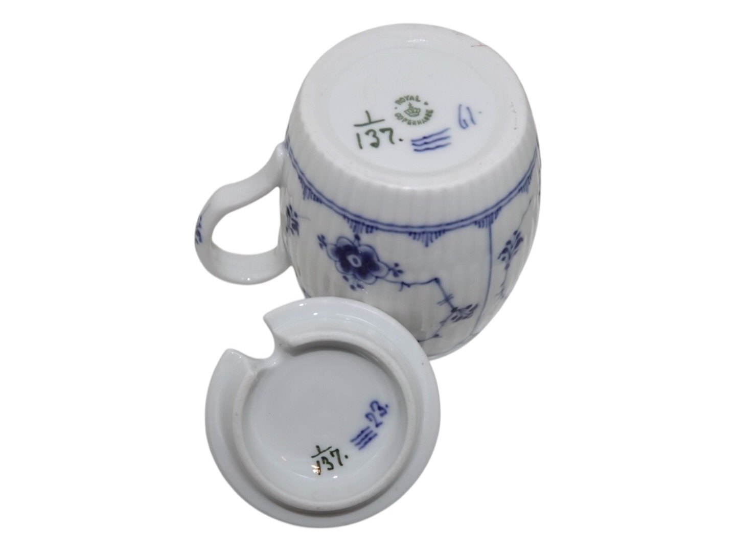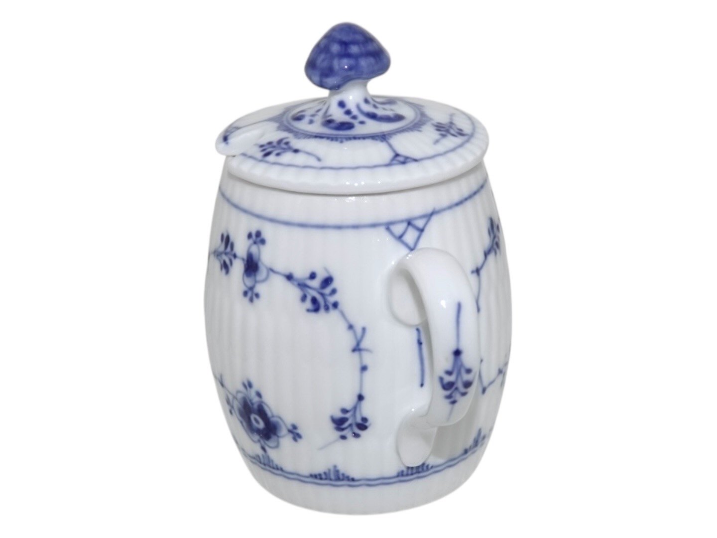 Royal Copenhagen Musselmalet Riflet, sennepskrukke med låg.Dekorationsnummer 1/137.