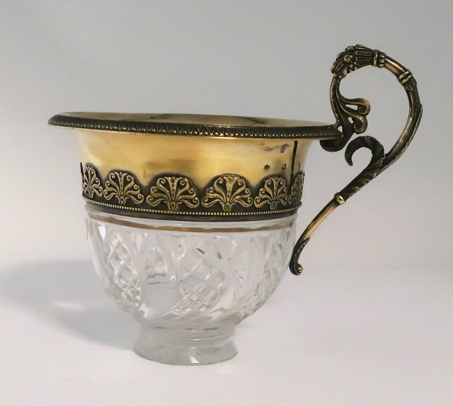 Fransk kop af krystal med sølv forgyldt montering. Kop og underkop. Højde 13 cm. Mindre kantafslag på undersiden af kop. Udstiller