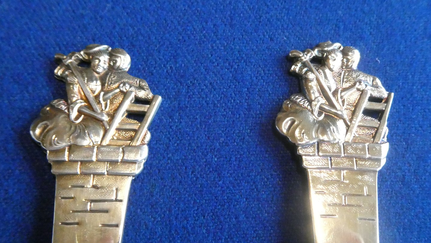 H.C. Andersen barnebestik i tretårnet forgyldt sølv med Hyrdinden og Skorstensfejeren.H.C. Andersen eventyr børnebestik.