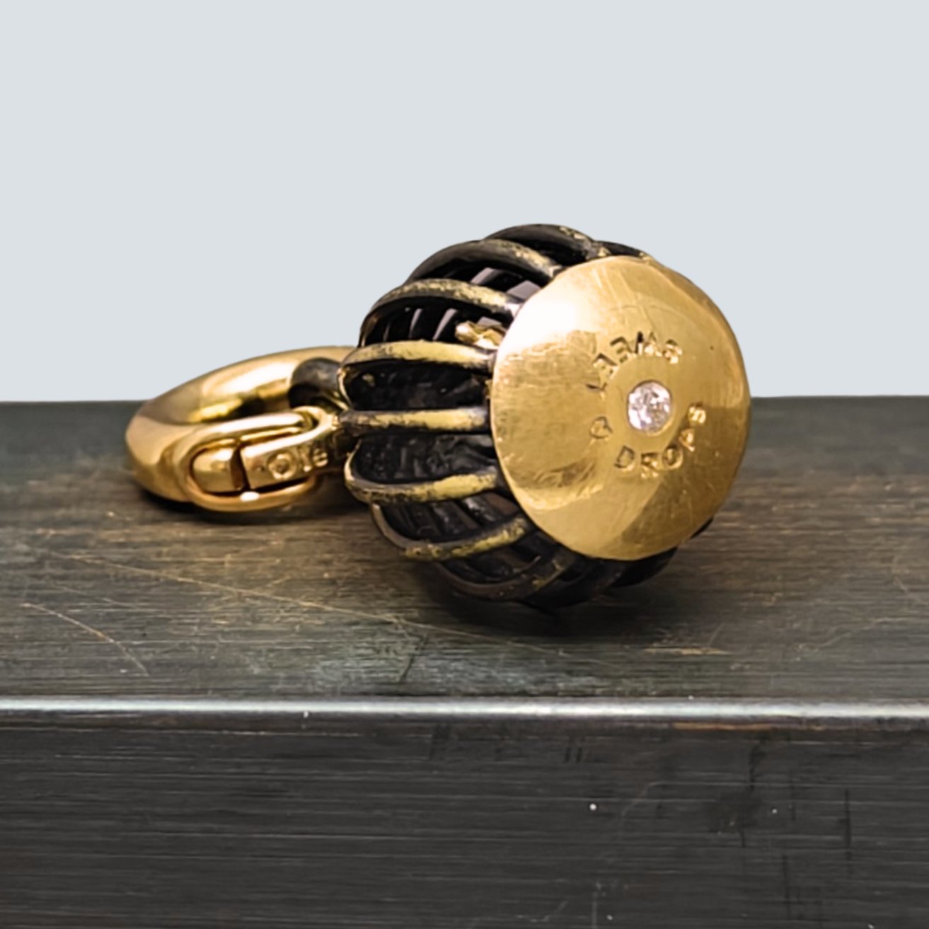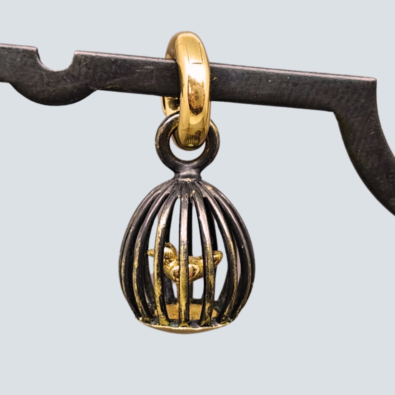 Ole Lynggaard guld smykke.Ole Lynggaard; Sweet drop charm til at sætte på armbånd eller halskæder. i 18 kt. guld, med diamant i bunden. Fuglebur med lille guldfugl inden i. Buret med oxideret overflade. Kan åbnes i øsknet, så den også kan sættes på en perle- eller stenkæde.