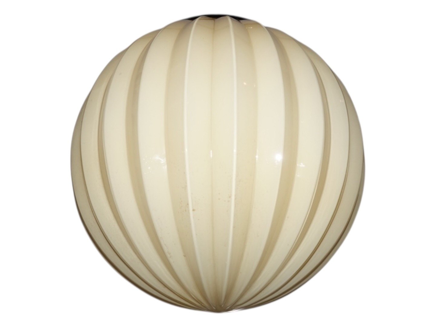 Art Deco loftslampe i cremefarvet rillet glas med messing stang.Lampen er fra omkring 1940.