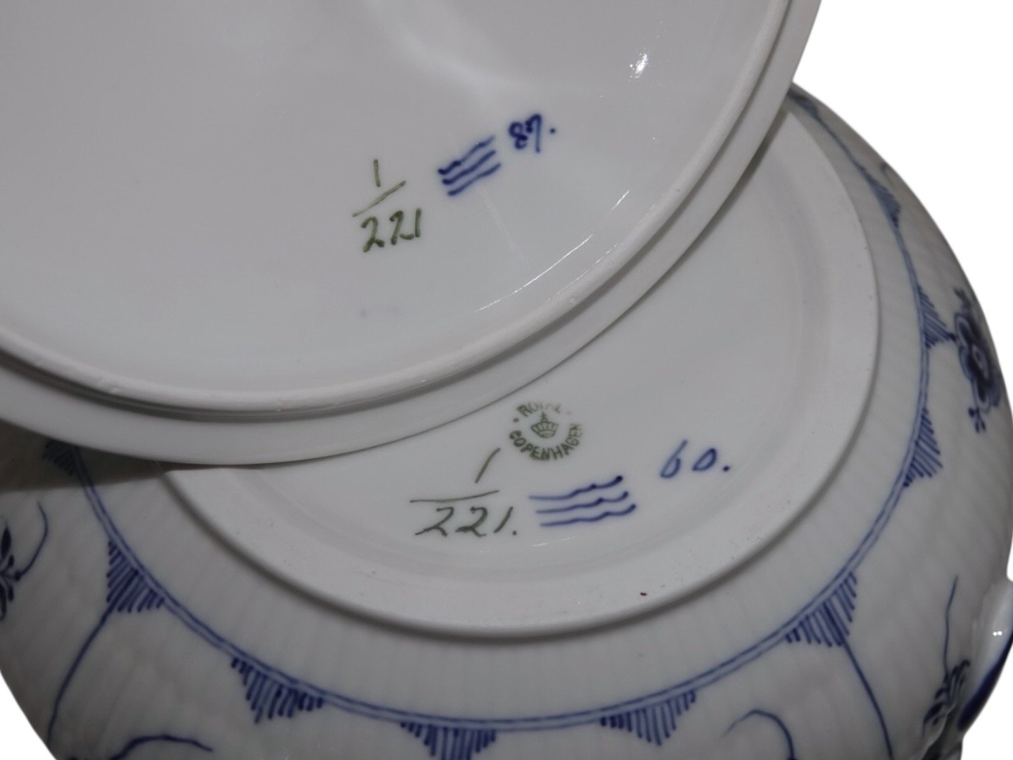 Royal Copenhagen Musselmalet Riflet, lille rund suppeterrin.Dekorationsnummer 1/221.