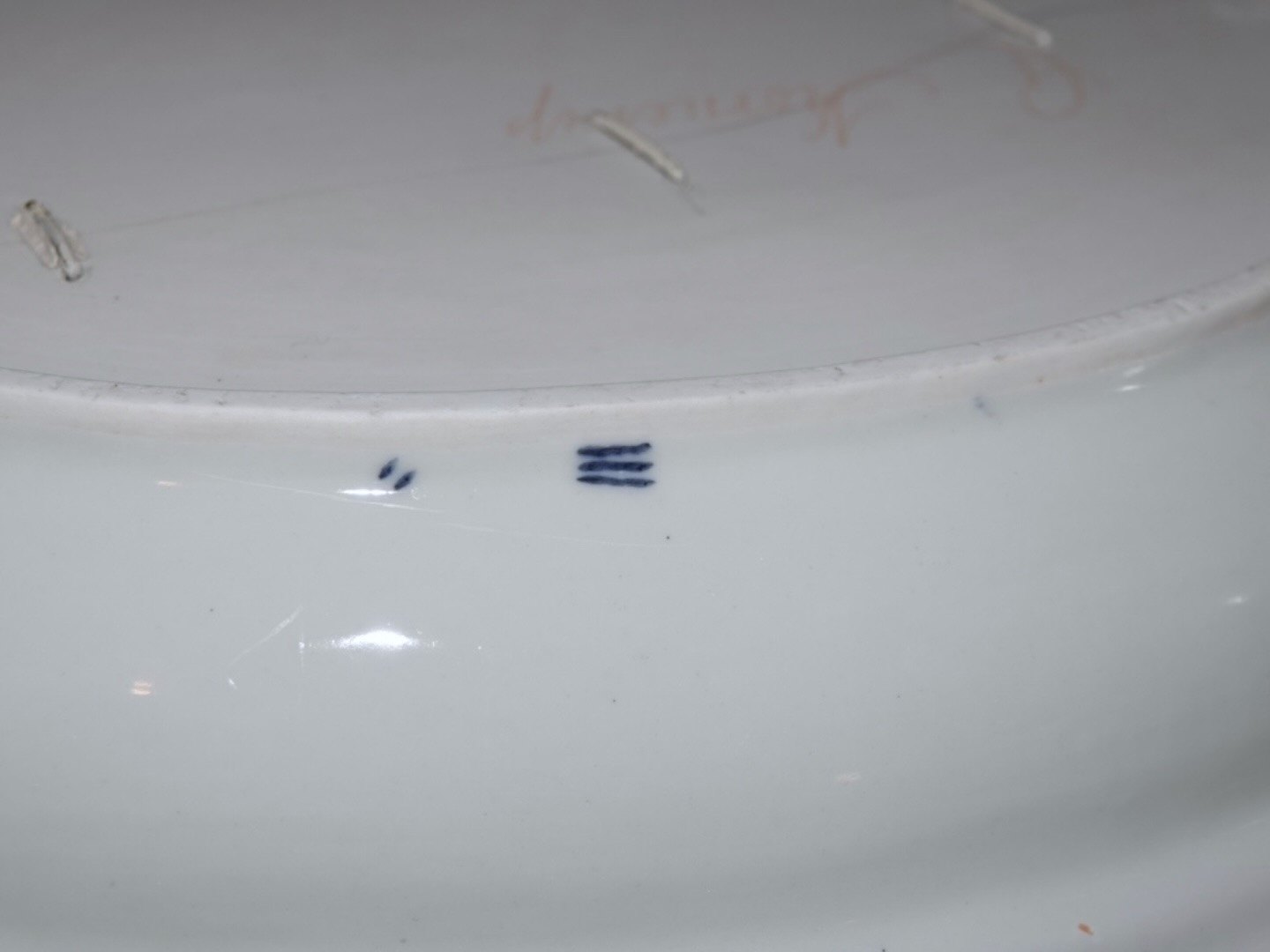 The bowl has an old repair after a crack and the is an old repair on the edge of, please see the pictures. The lid is in perfect condition.