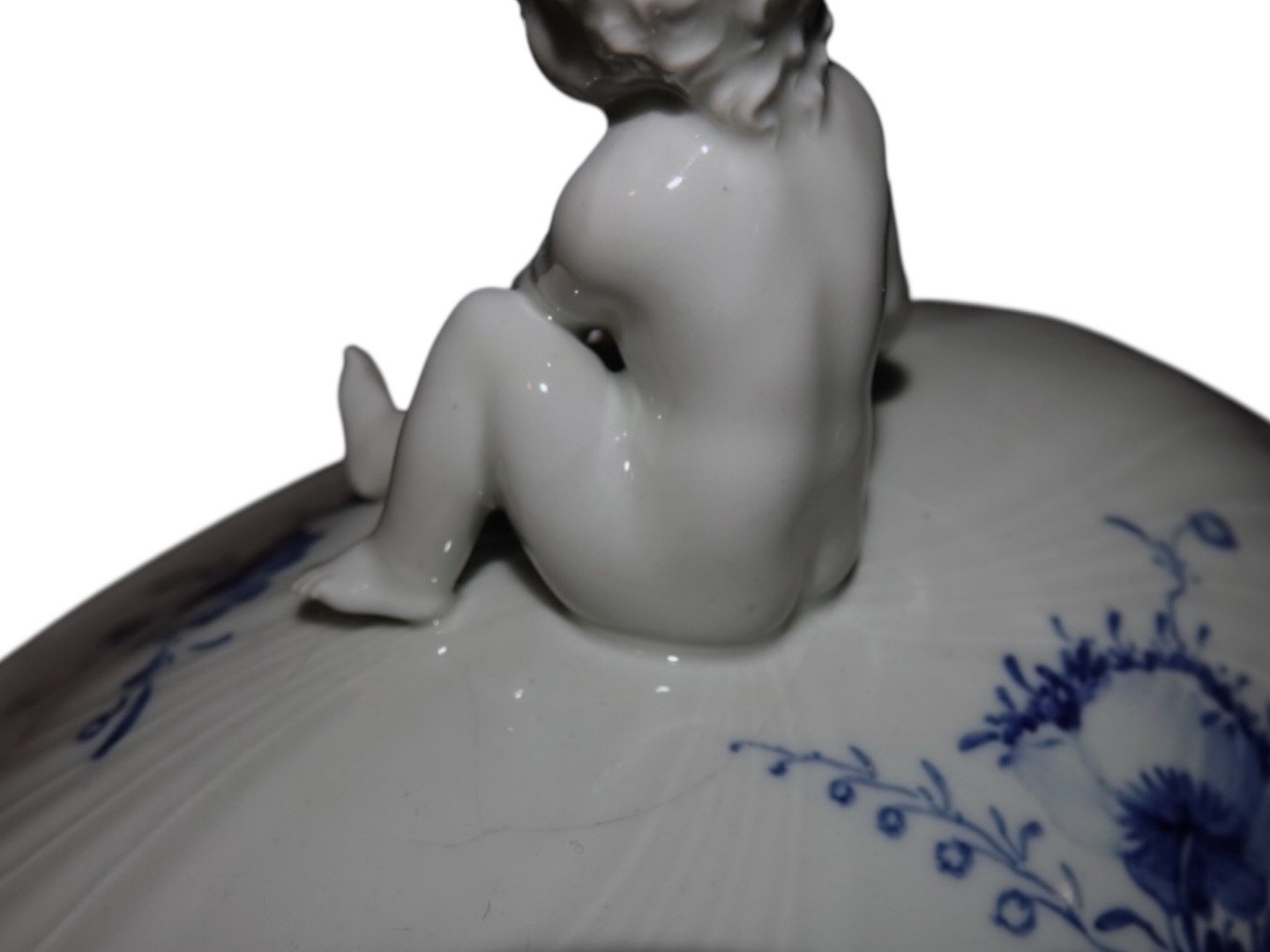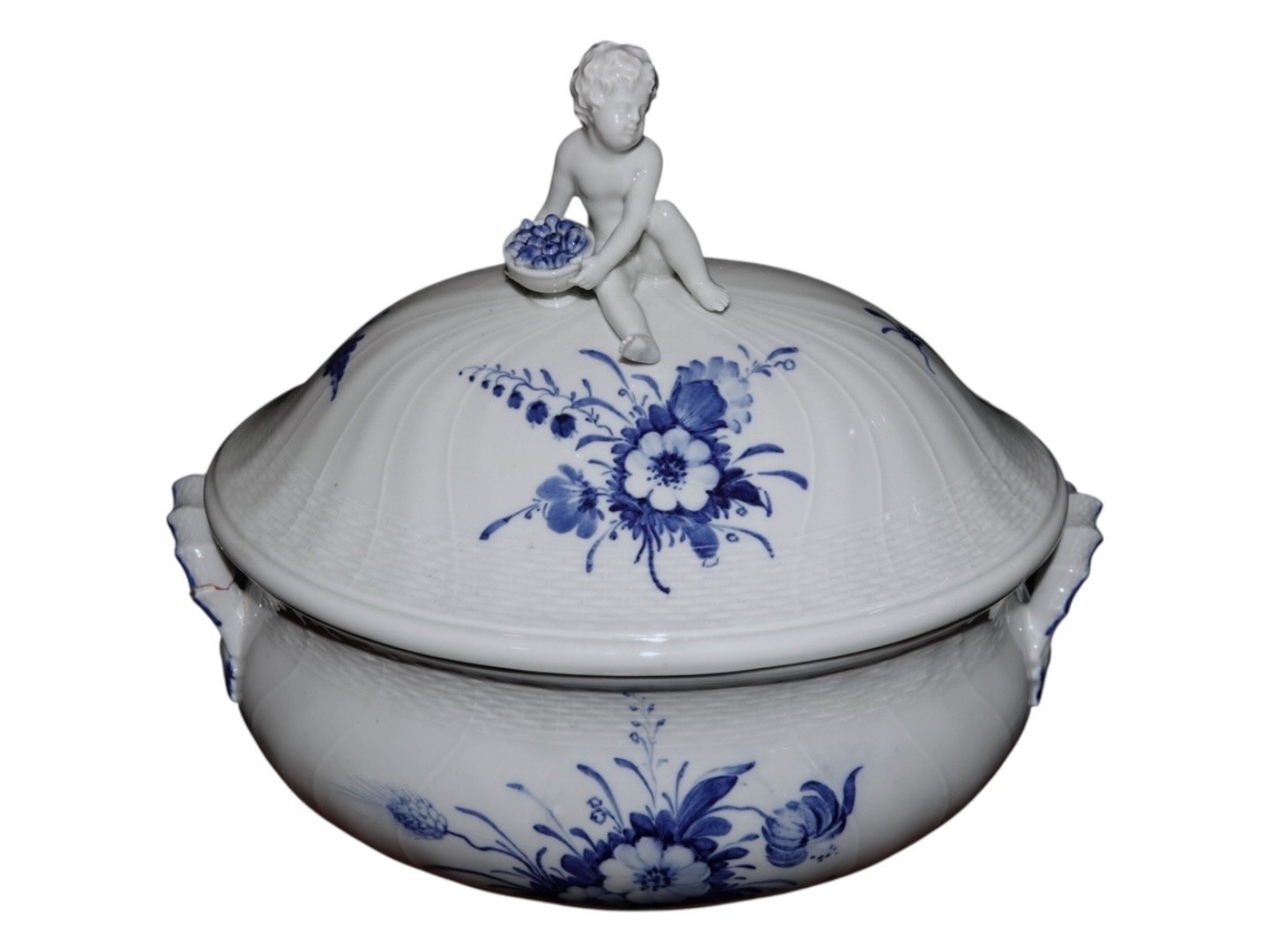 Royal Copenhagen Blue Flower Curved, extra large soup tureen with a boy figurine on top. It is an early piece that is grey in the porcelain instead of white.The item is in our remote warehouse. You can purchase it online or contact us if you would like to see it in the shop. We can usually have it available the same day.