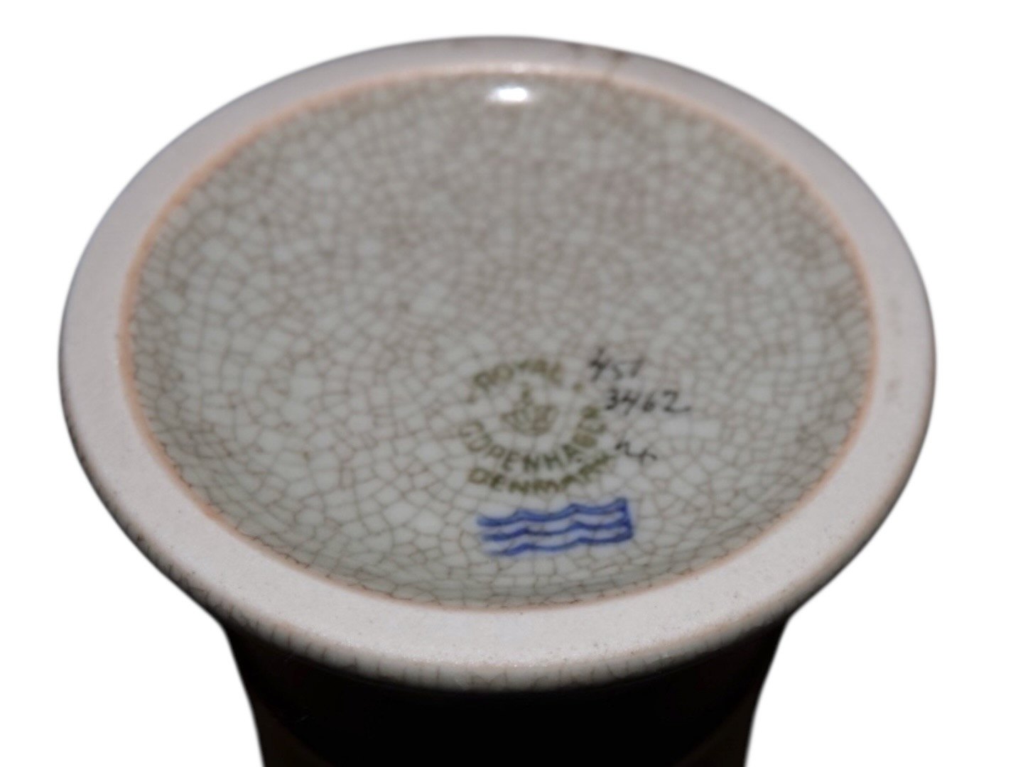 Royal Copenhagen Craquele (Krakele), vase med grøn dekoration.Varen er på fjernlager. Bestil online, eller kontakt os, hvis du vil se den i butikken — vi kan ofte have den klar samme dag.