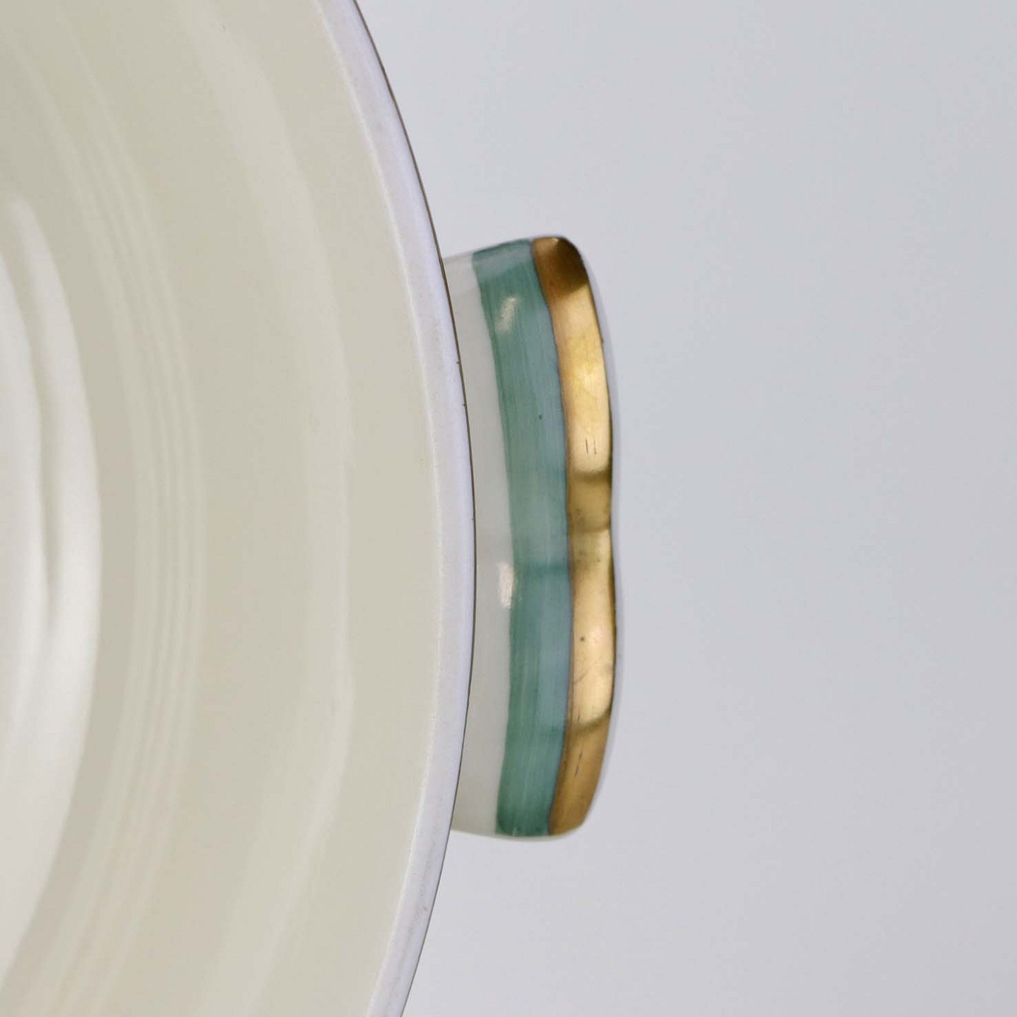 Stel i glat råhvidt porcelæn dekoreret med lysegrøn stribe og guldkant samt motiv af hjertegræs.