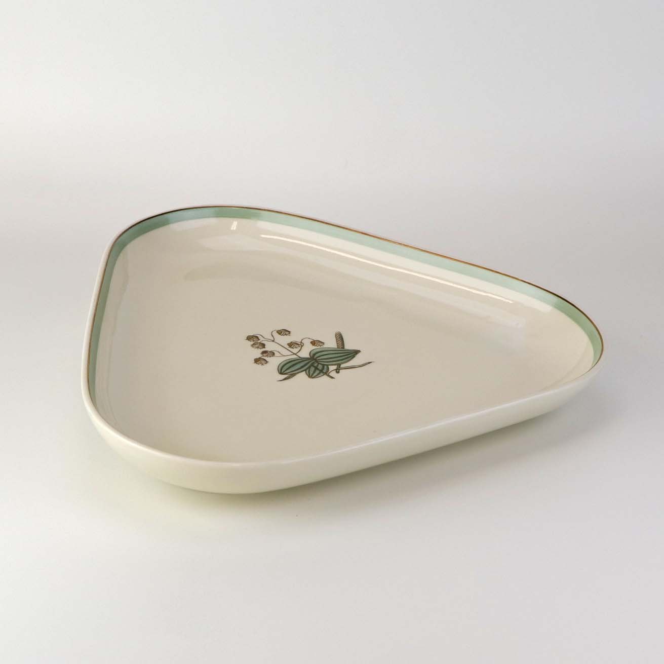Trekantet serveringsfad i kongelig porcelæn fra stellet Hjertegræs. Nr. 884/9721Formgiver Thorkild Olsen