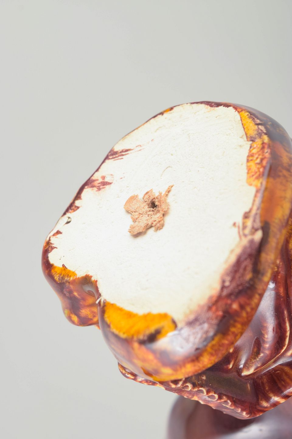 Unik, håndformet figur af fugl i glaseret stentøj med levende, flammende rød-orange glasur og kraftfuldt modelleret formsprog. Signeret med monogram under bunden.