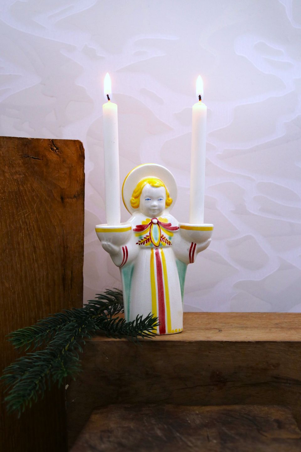 Aluminia fajance jule engel der bære 2 små stearinlys.Højde: 13,5cm.