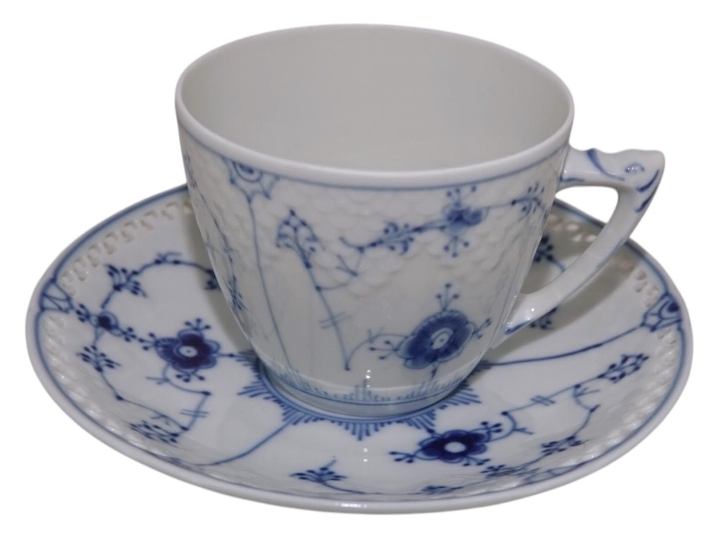 Bing & Grøndahl Blåmalet (Musselmalet), kaffekop med blondekant på underkoppen.Af fabriksmærket kan det udledes, at disse er produceret mellem 1970 og 1983.