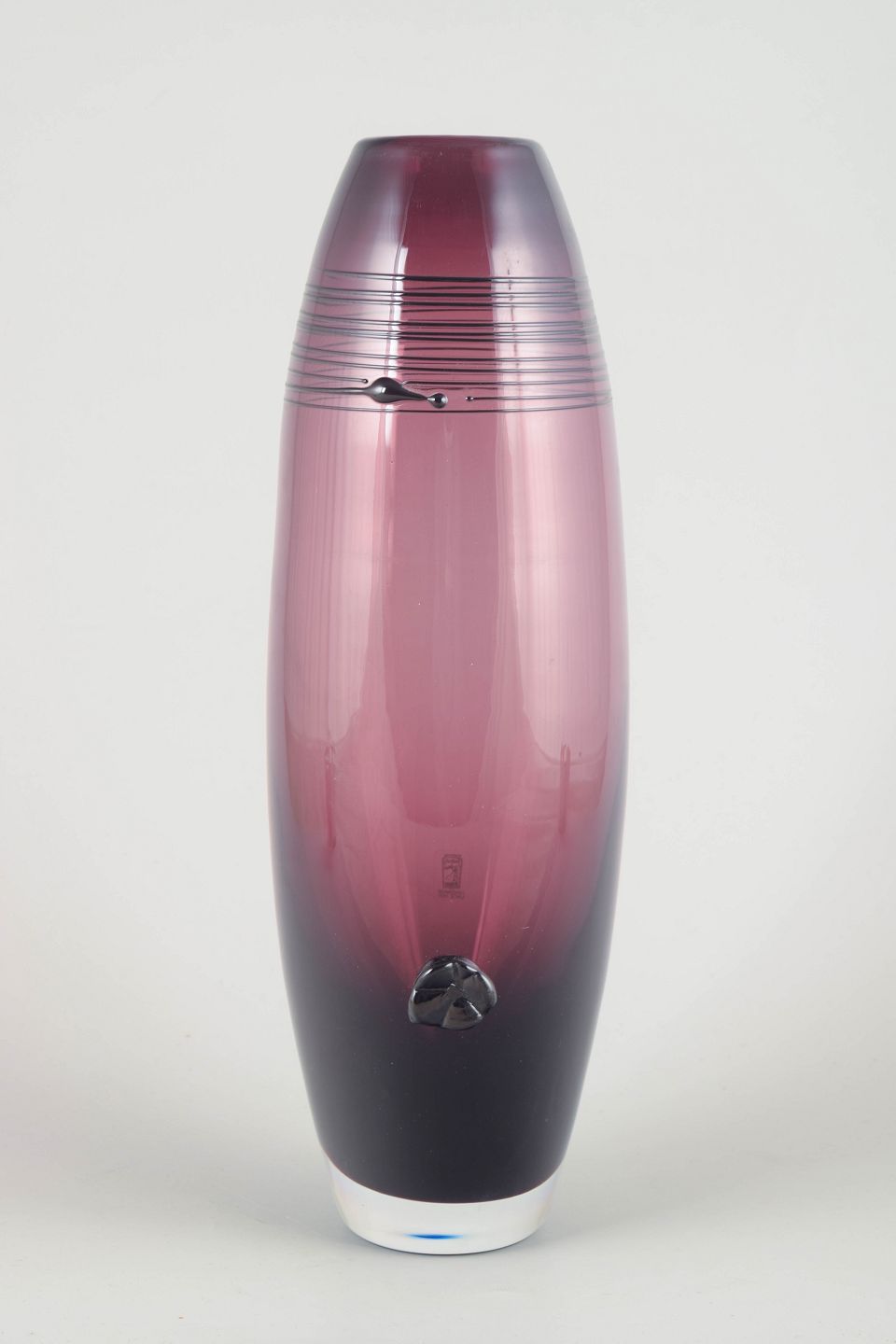 Stor håndlavet kunstglasvase i dyb ametystfarve med sort base og klare detaljer. Elegant cylindrisk form med slebet kant og indgraveret signatur fra Helén Tapper for Johansfors Glasbruk. Et karakteristisk eksempel på svensk glasdesign fra 1970’erne.