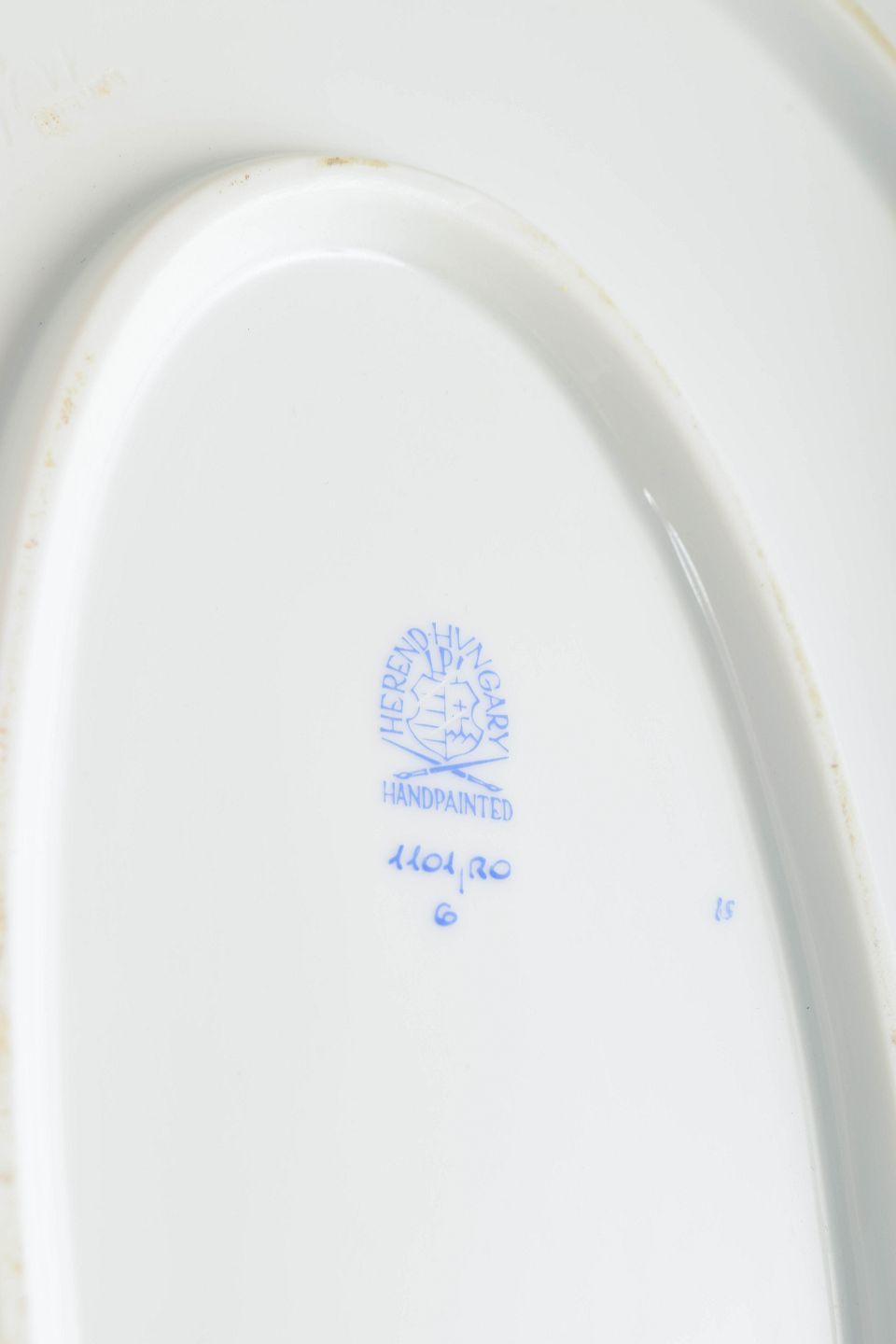 Stort ovalt serveringsfad i håndmalet porcelæn med motiv af fugle på gren og sommerfugle, kantet med forgyldt rand. Klassisk Herend-dekoration i fine farver og detaljeret penselføring.