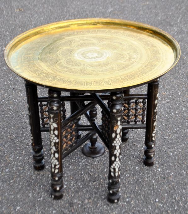 Arabisk rygebord med messingplade, 19./20. årh. Messsingplade dekoreret med mønstre. Understel i træ med indlagt perlemor. H.: 49 cm. Dia.: 59 cm.Emne nummer: 28341