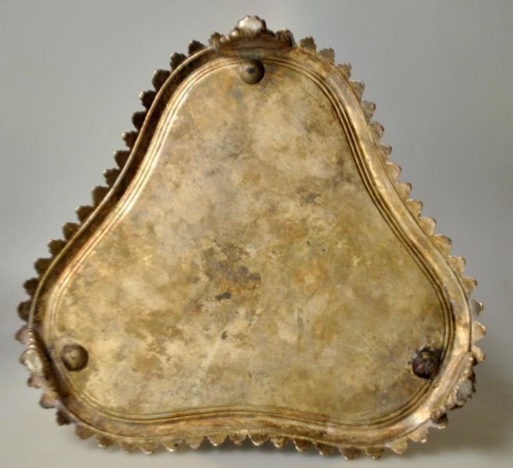 Engelsk forsølvet vinholder, 20. årh. Trekantet form til tre flasker med holder. H.. 26 cm. B.: 25 cm.Emne nummer: 28346