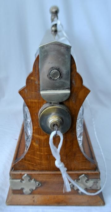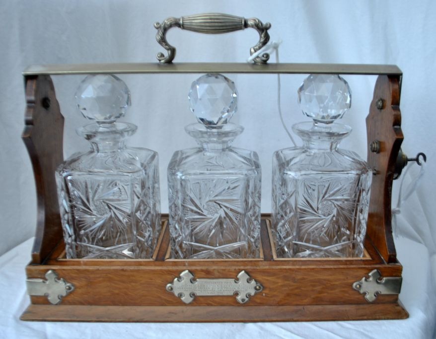 Engelsk tantalus med tre karafler, 19. årh. Poleret egetræ. Med forsølvede beslag og lås med nøgle. H: 32 cm. L: 41 cm.Emne nummer: 28487