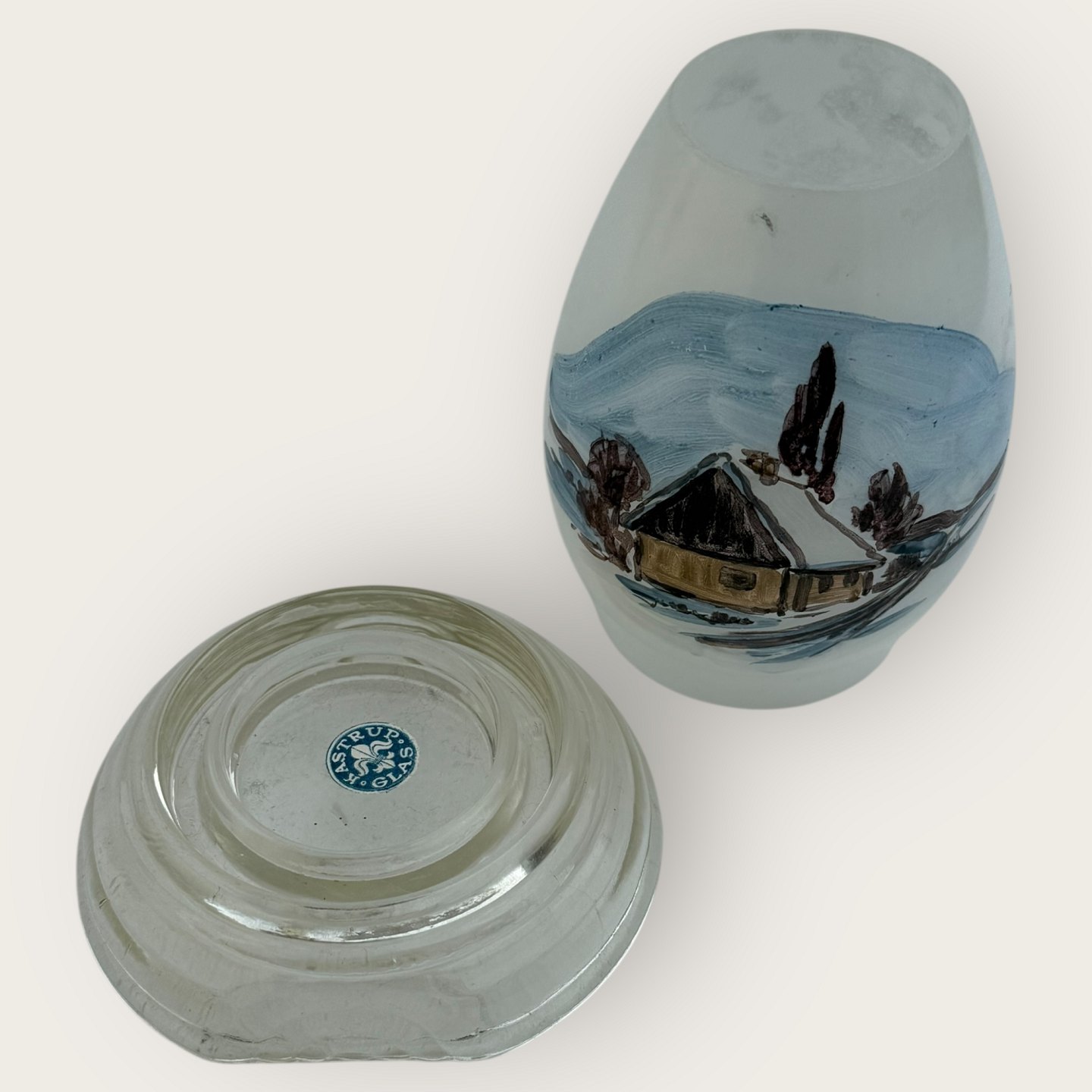 Kastrup Glasværk, hyggelampe med håndmalet dekoration til fyrfadslys, ca. 9cm høj *Et par mørke pletter i det øverste glas ellers fin stand *Lager: 1