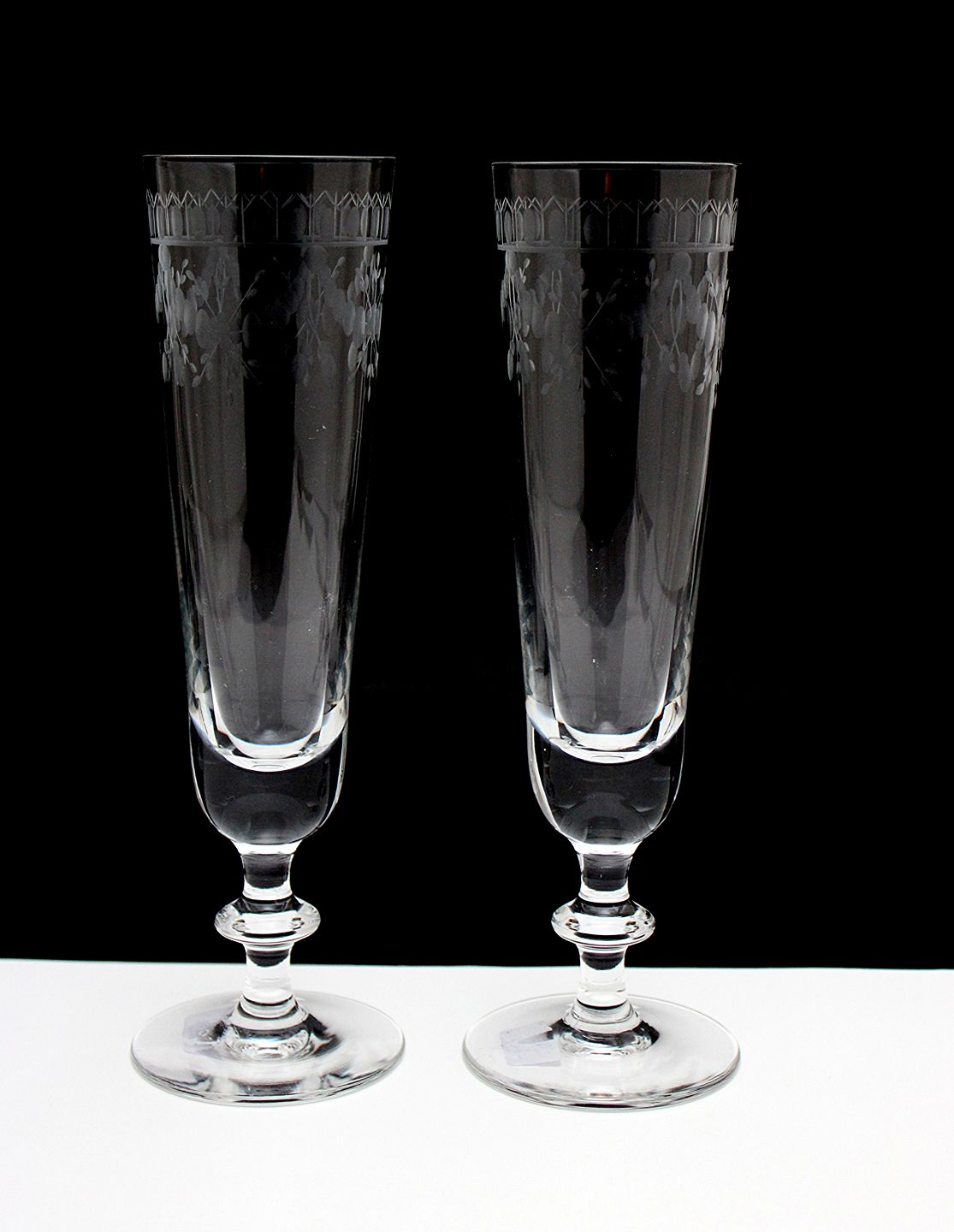 Krystal Champagnefløjter graveret med ranker og guirlande bånd. Højde 19,5 cm. Diameter øverst 5,2 cm. Pris samlet 2 stk: 300 kr. Udstiller