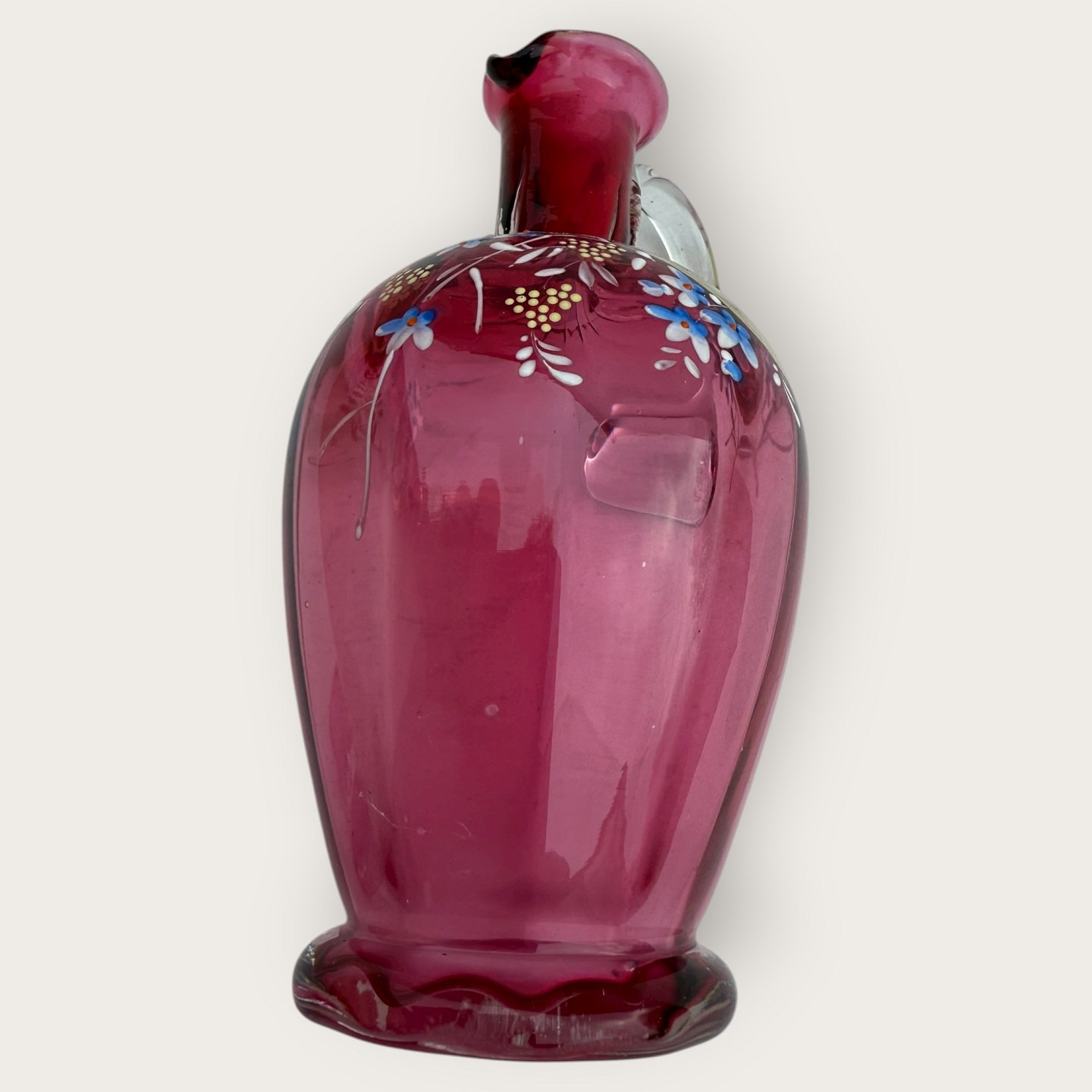 Ældre midteuropæisk karaffel i pinkfarvet glas med bemaling, medfølgende 2 glas, Karaffel ca. 21cm høj og 9cm bred, de to glas har meget små nøk i kanten, karaflen er i fin stand.Lager: 1