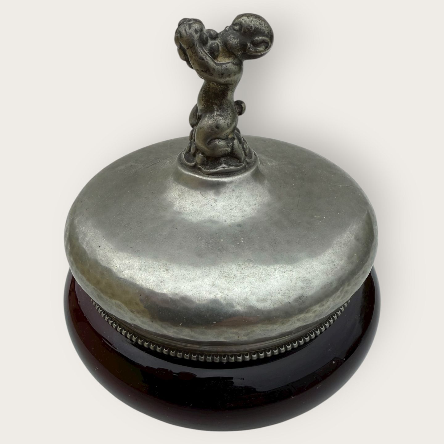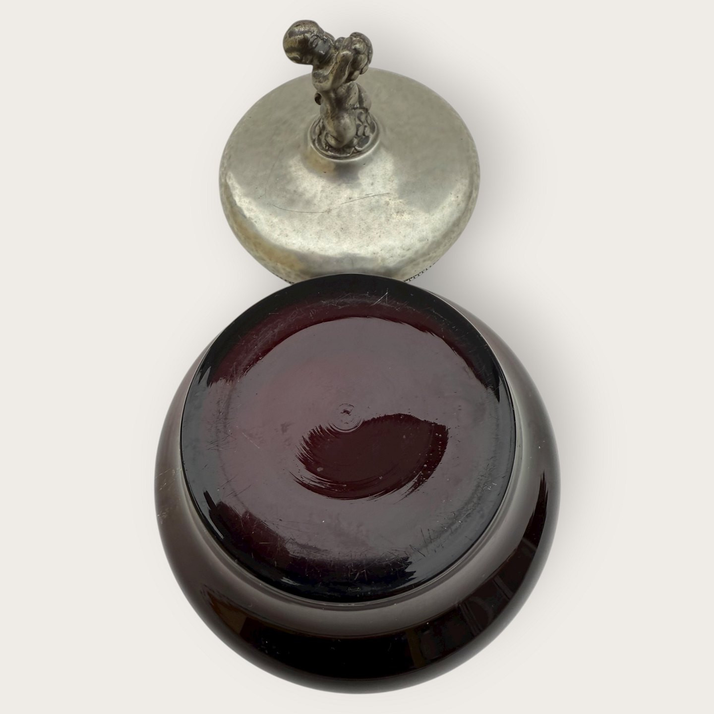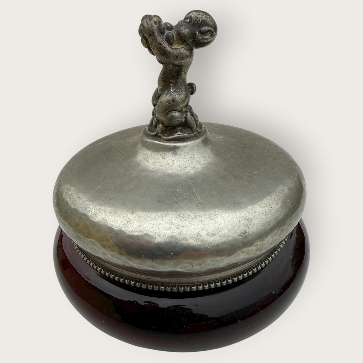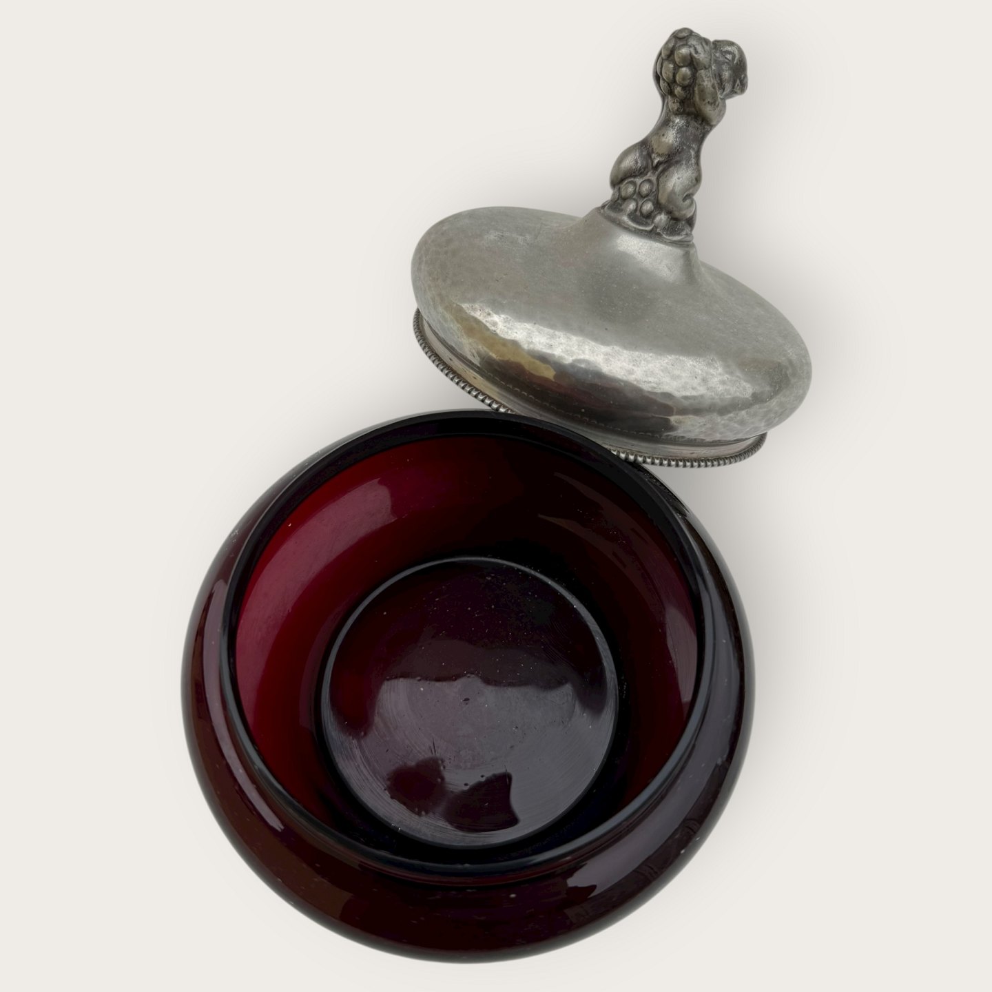 Einar Dragsted, Rød glasskål med låg af tin og figuren Bacchus / Dionysos på midten af låget, låget stemplet indvendigt med grif og ED for Einar Dragsted, Højde 15cm, diameter 13cm *pæn patineret stand*Lager: 1