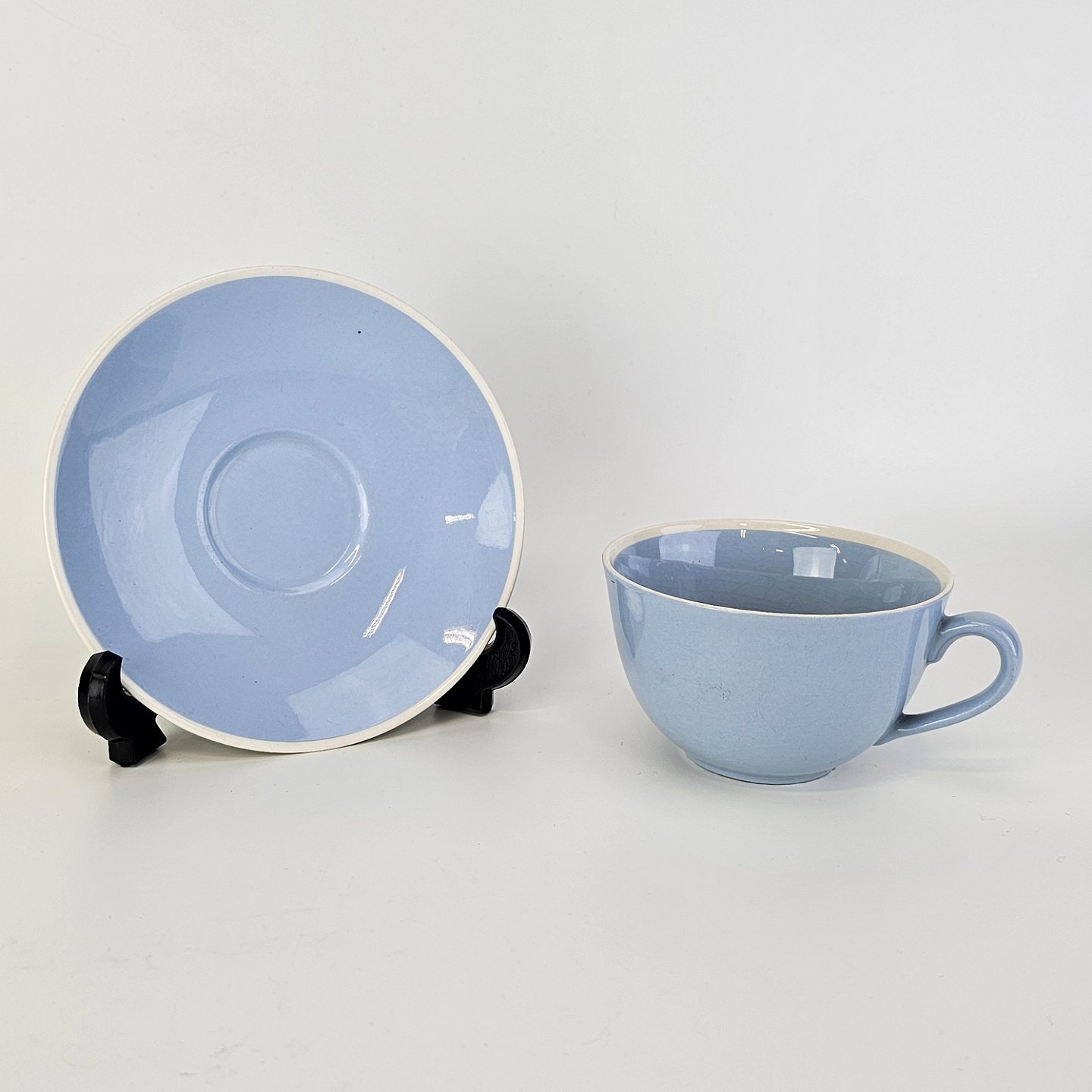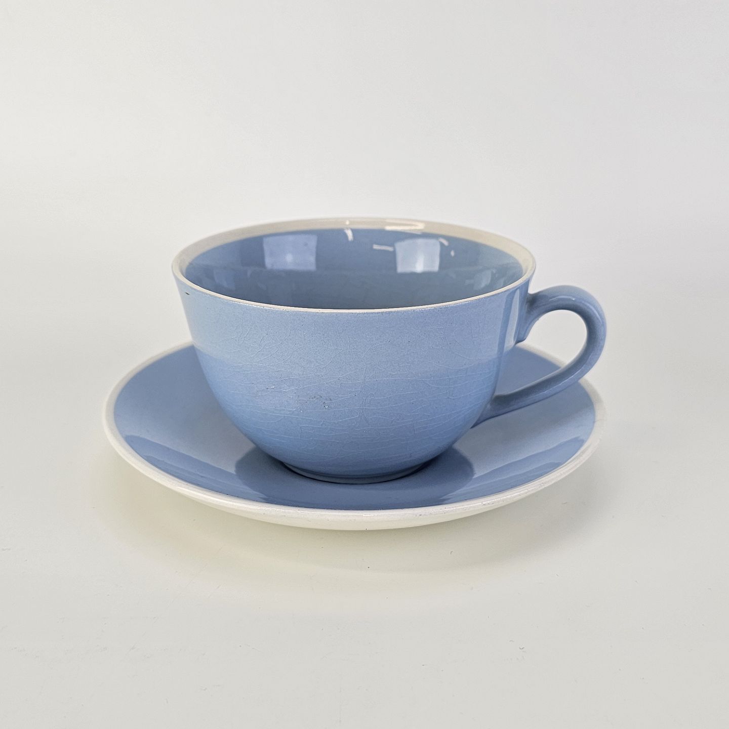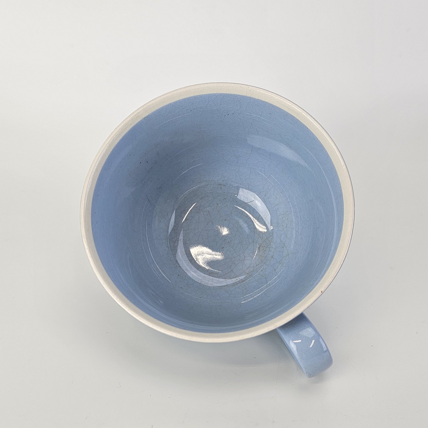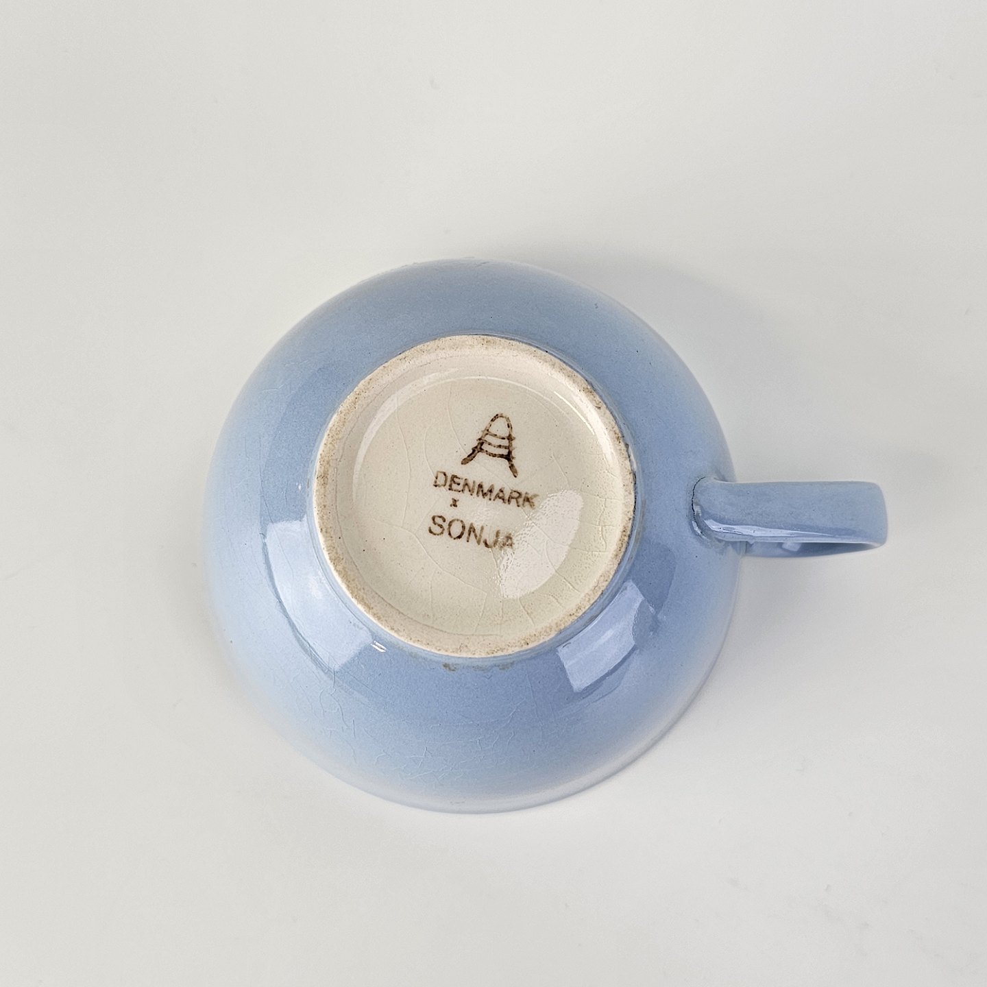 Fremstår med krakeleringer i glasuren og nister på underkoppen