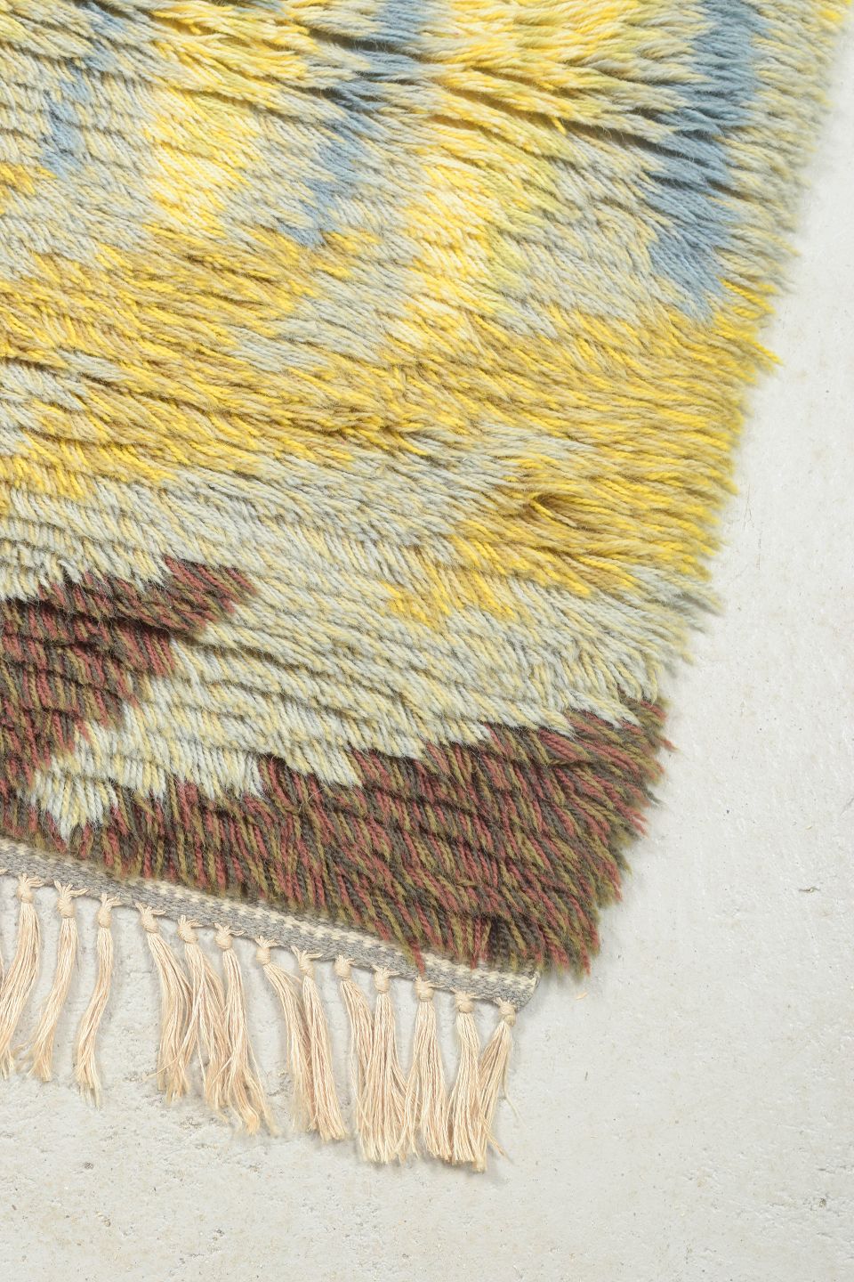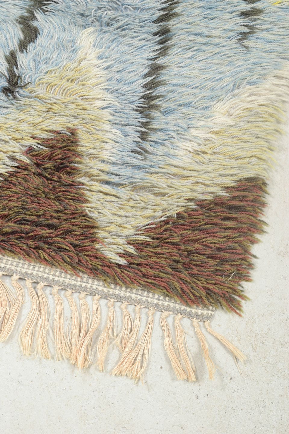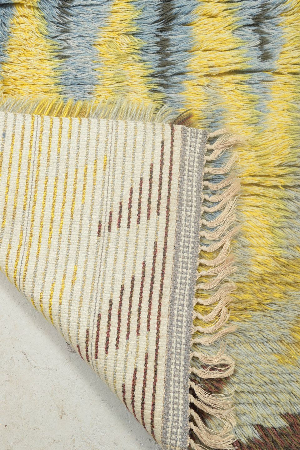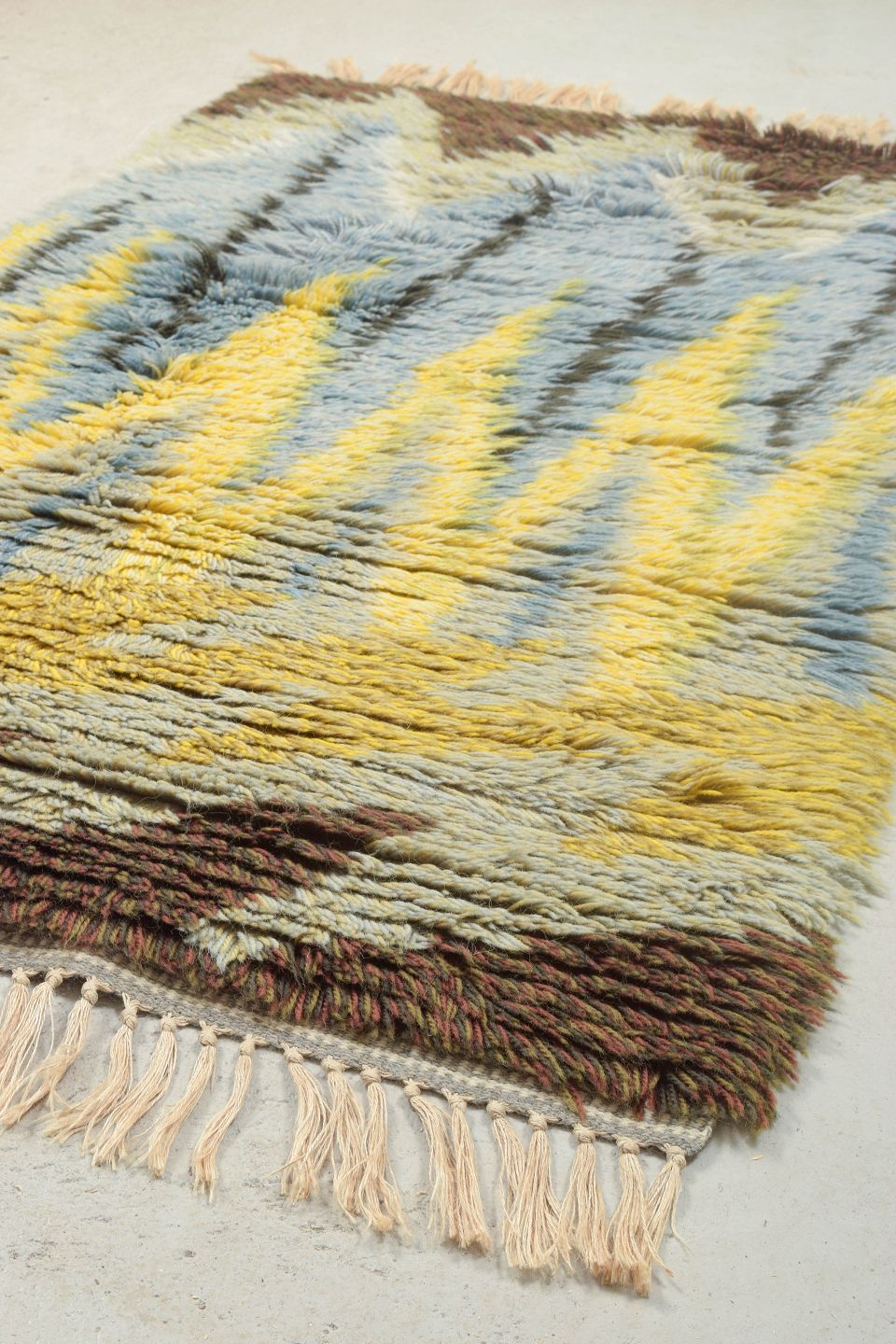 Håndknyttet rya-tæppe i uld med zigzag-inspireret mønster i gule, blå, brune og grå nuancer. Et karakteristisk design fra perioden, hvor stærke kontraster og geometriske former blev anvendt til at skabe liv og bevægelse i det skandinaviske tekstiludtryk.