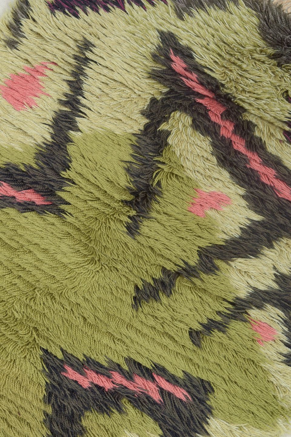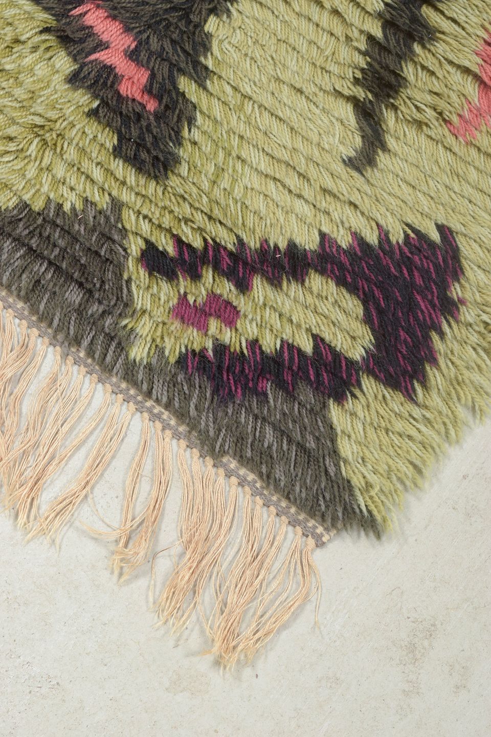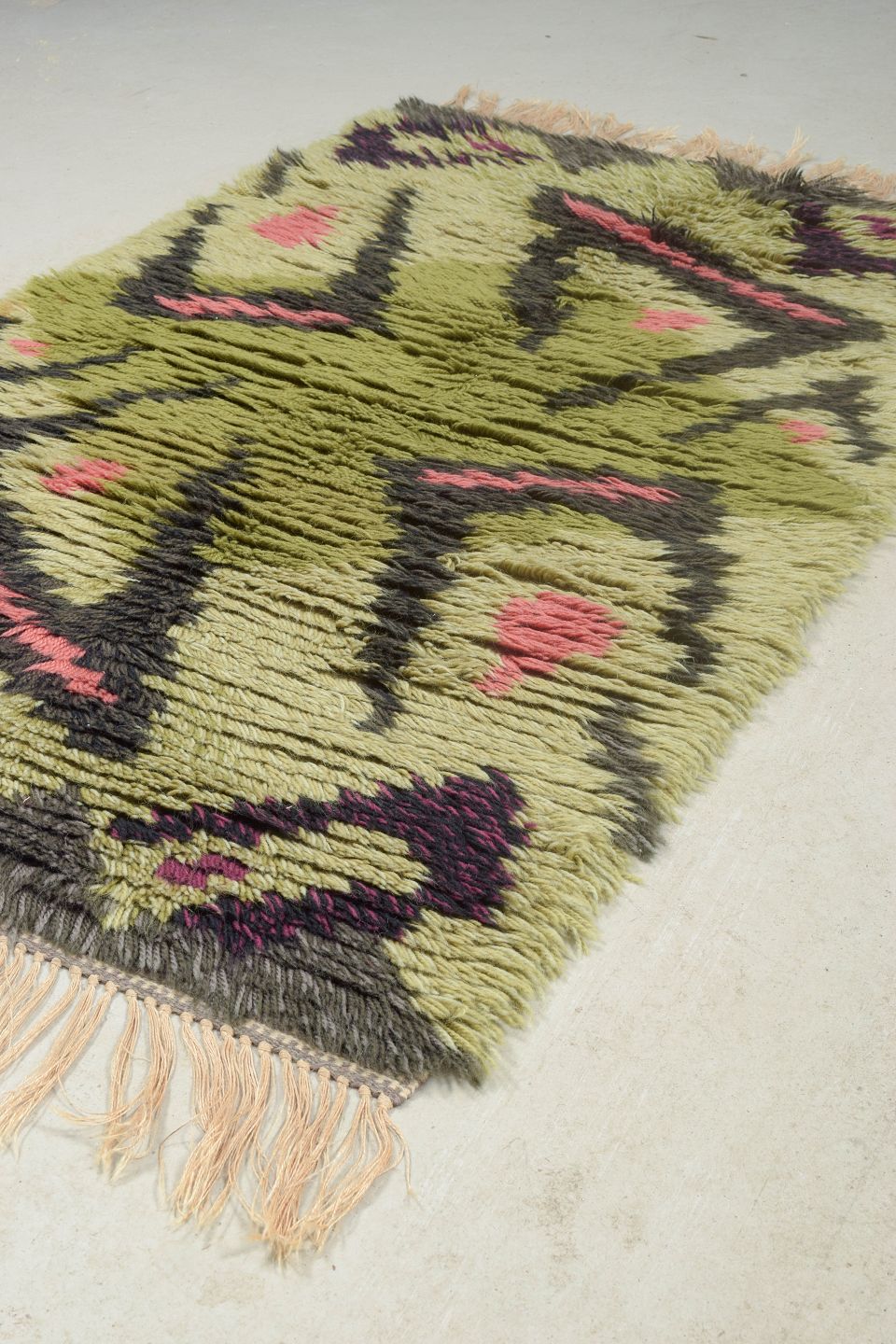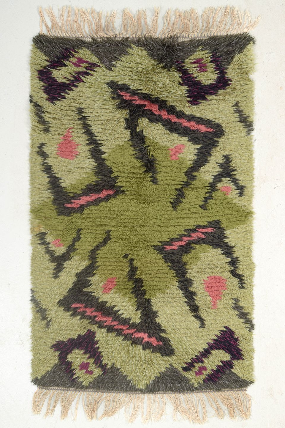 Håndknyttet rya-tæppe i uld med grafisk mønster i olivengrøn, pink, sort og mørklilla. Et livligt og karakteristisk design fra perioden, hvor stærke farver og abstrakte former blev anvendt til at skabe dynamiske og kunstneriske tekstiler.
