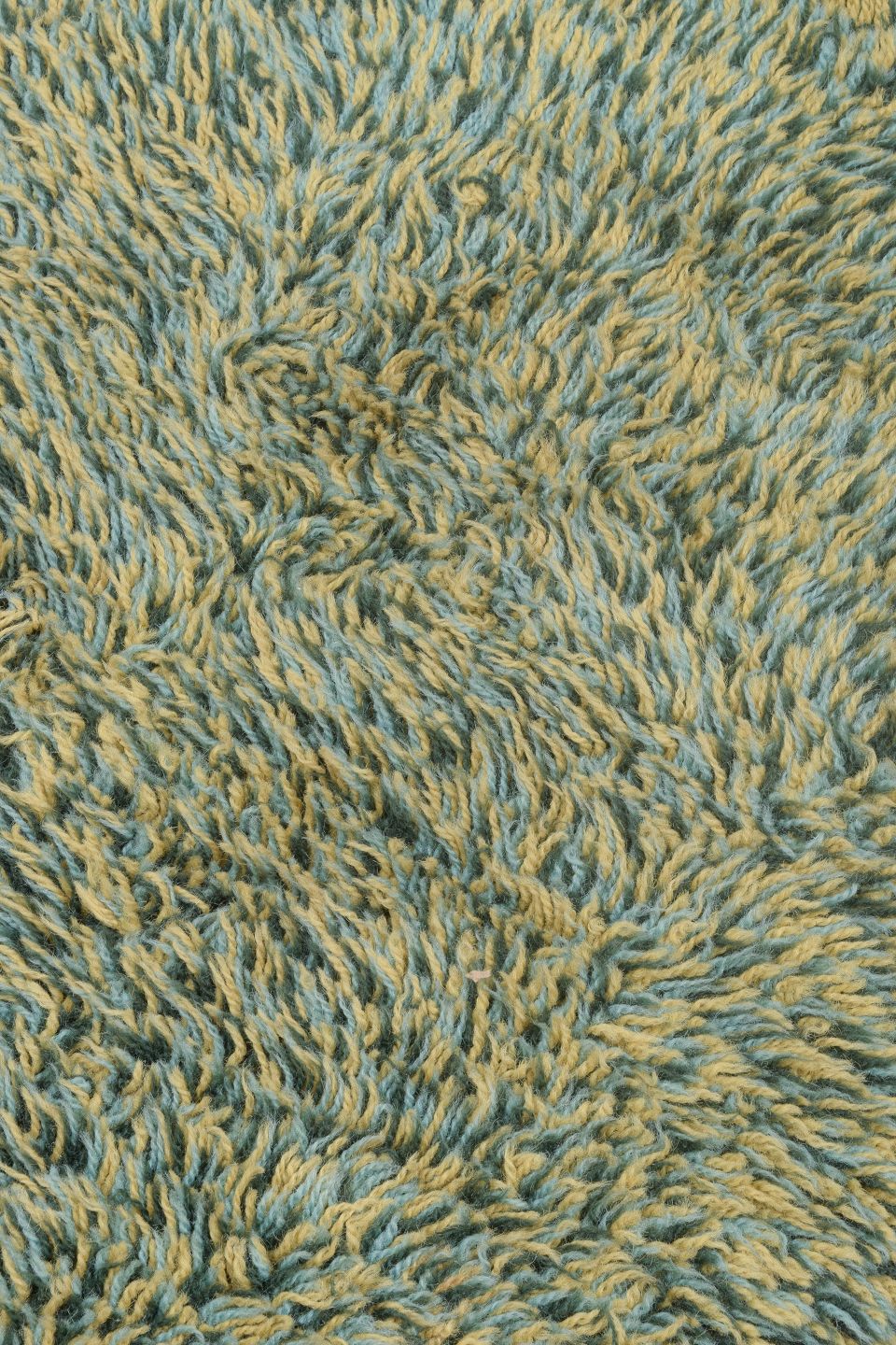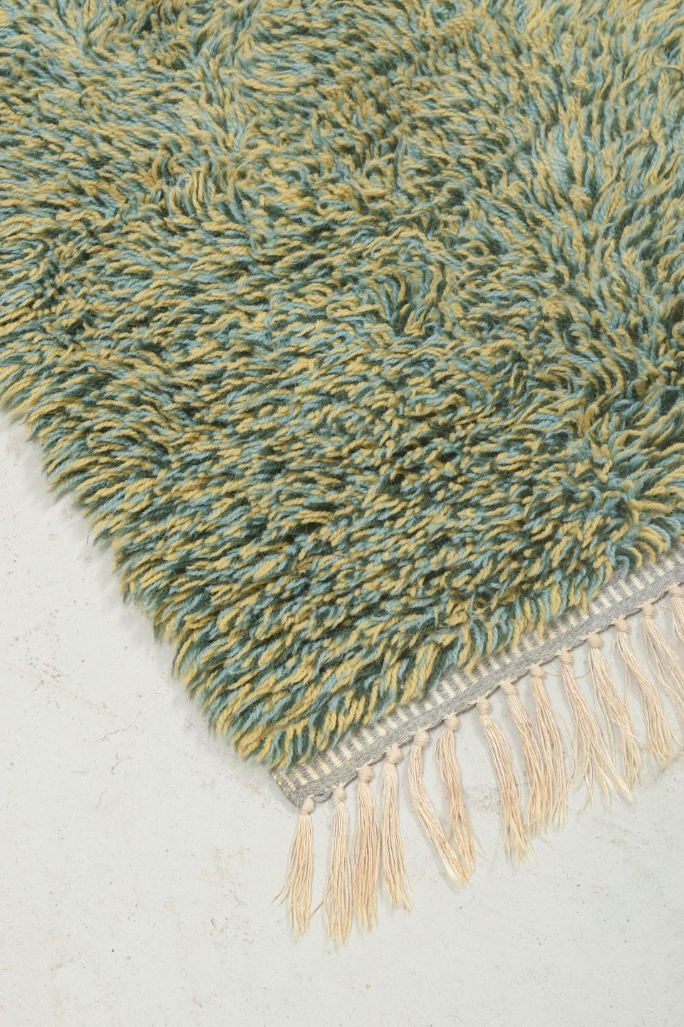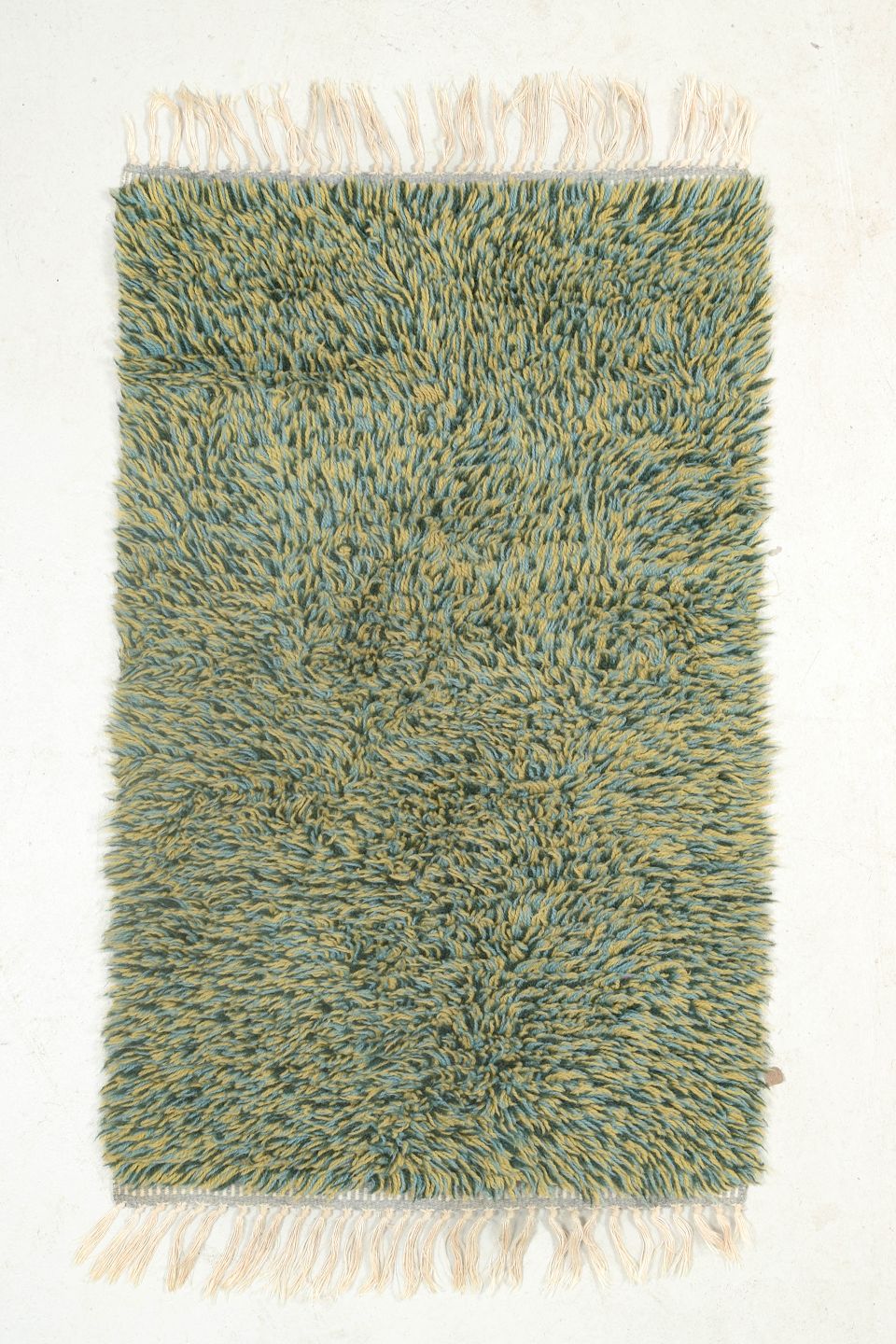 Håndknyttet rya-tæppe i uld med tæt luv i grønne og beige nuancer. Et enkelt, harmonisk design med naturlig farvepalet og blød tekstur, karakteristisk for skandinavisk tekstilkunst i perioden, hvor fokus lå på materialets kvalitet og taktile udtryk.