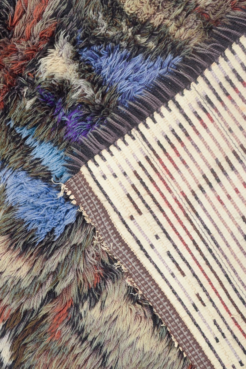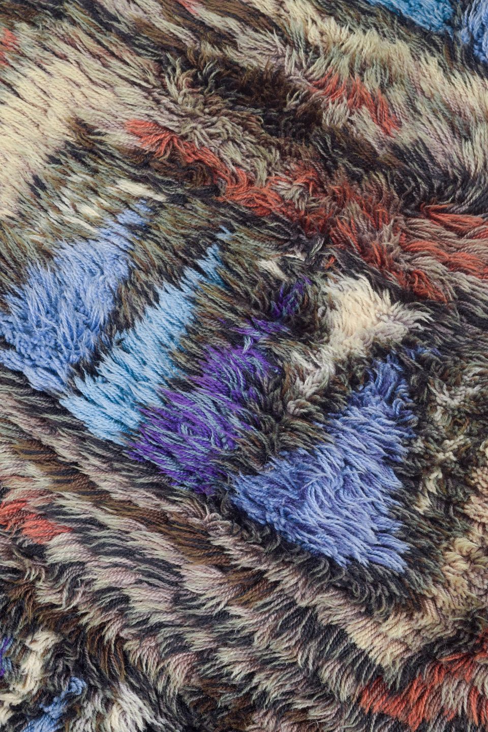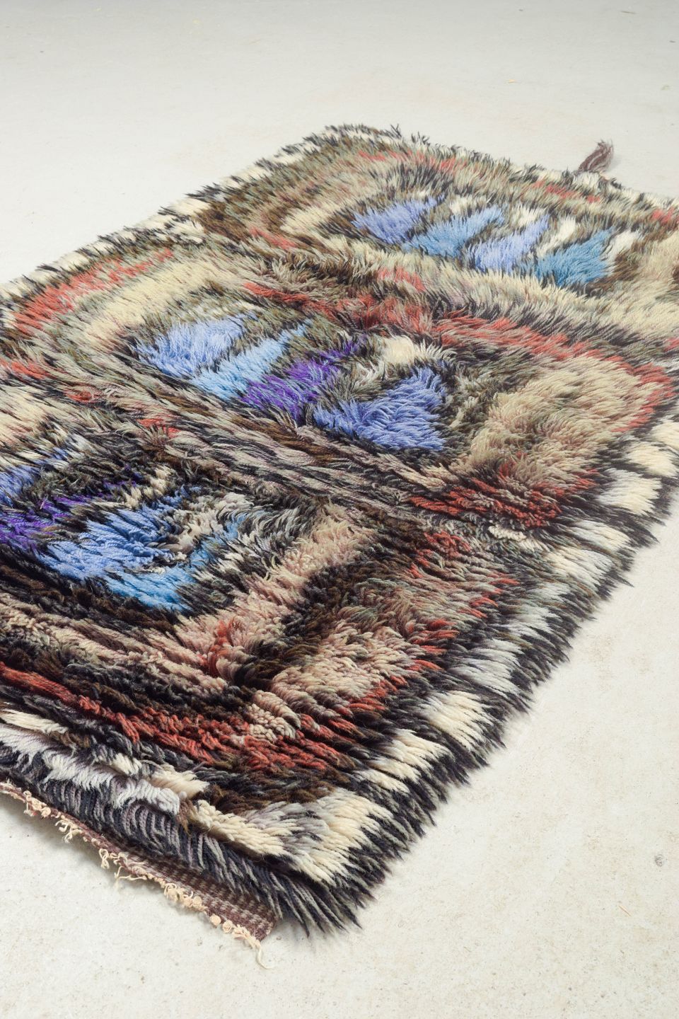 Håndknyttet rya-væg­tæppe i uld med geometrisk mønster i blå, lilla, beige og brunlige nuancer. Tæppet har ophængssnor og er udført i klassisk skandinavisk stil fra perioden, hvor tekstilkunsten bevægede sig mod mere dekorative og kunstneriske udtryk.