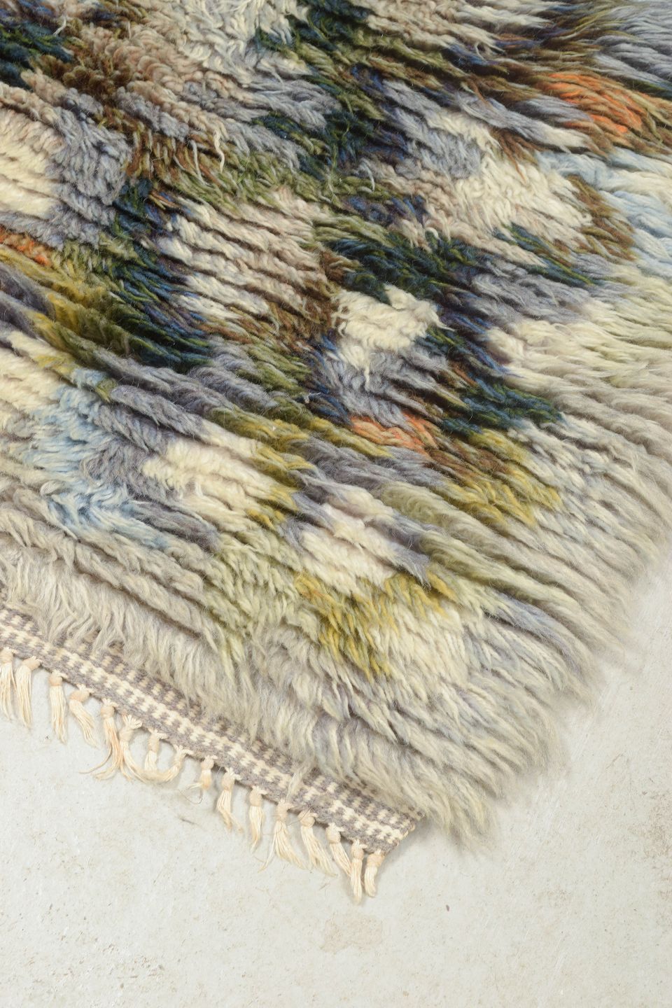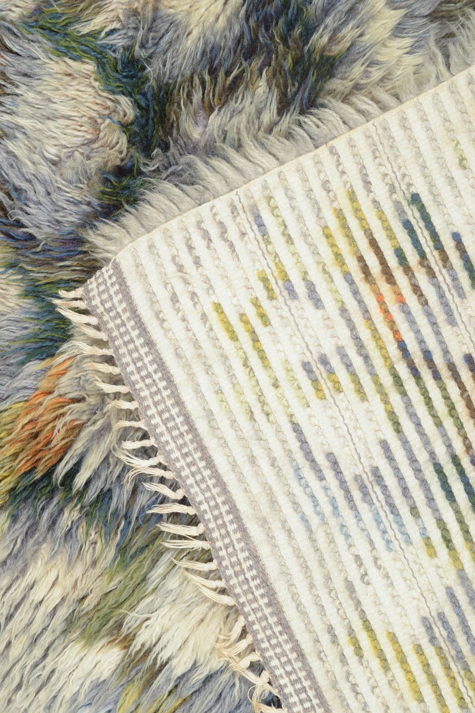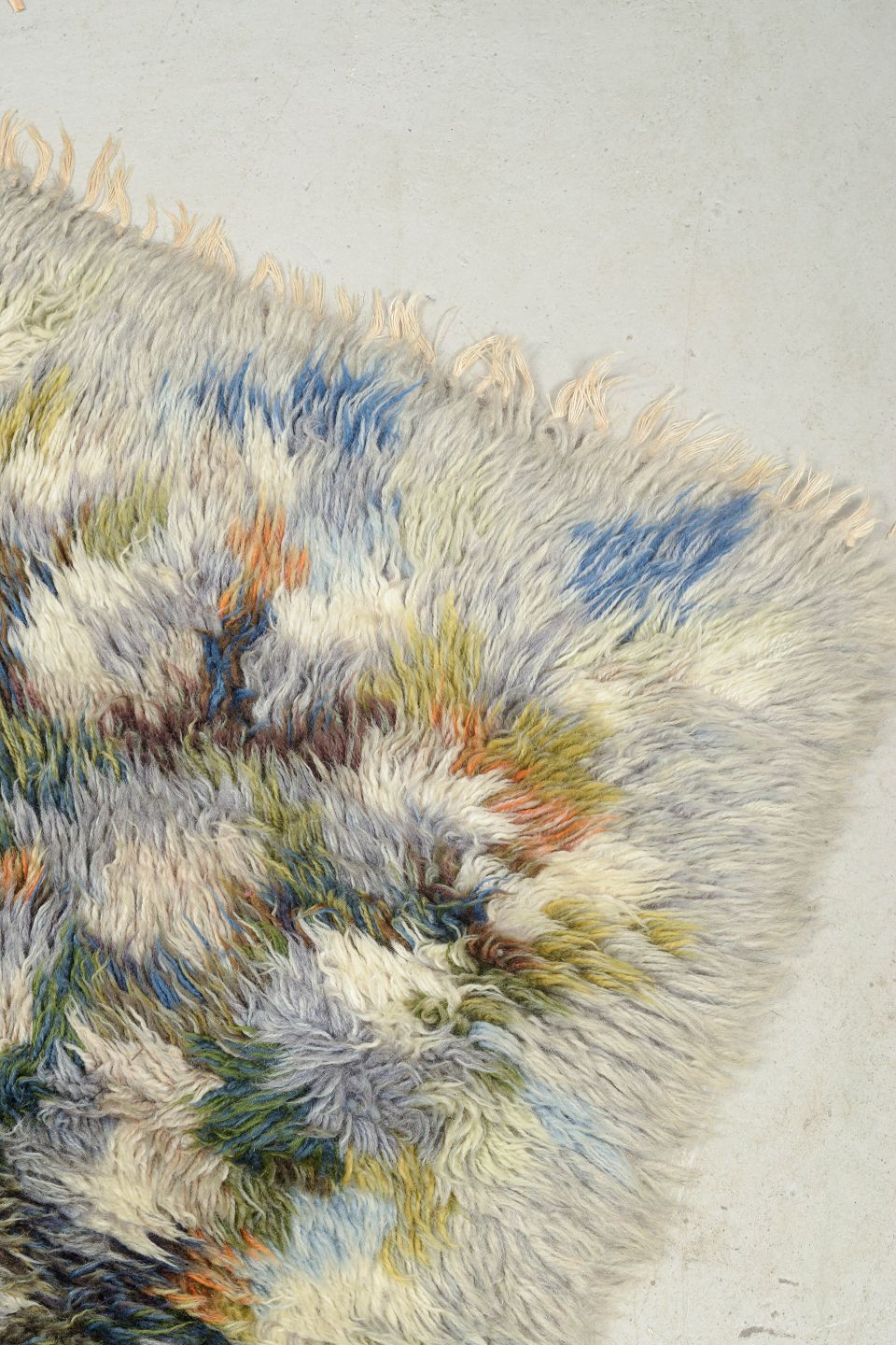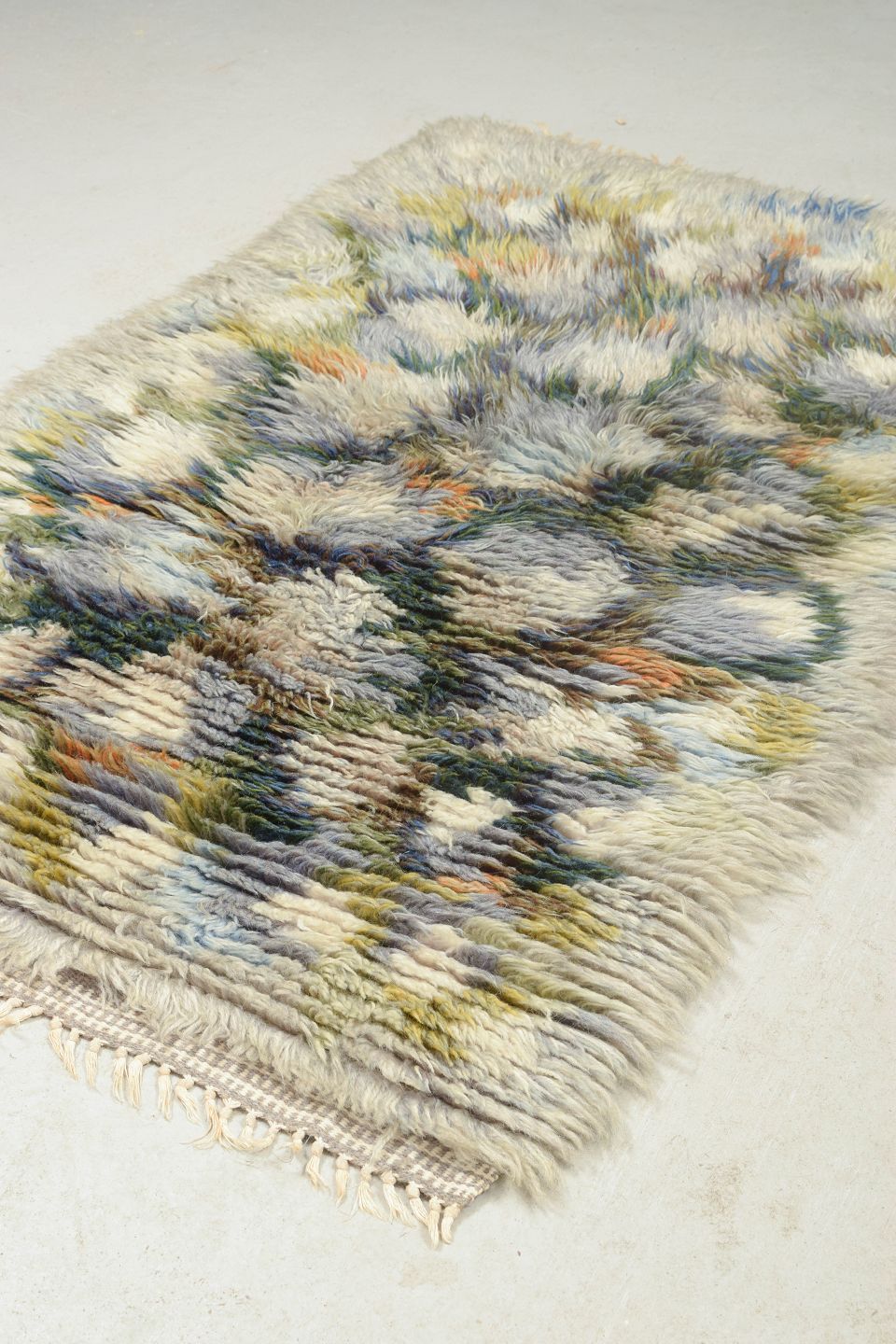 Håndknyttet rya-tæppe i uld med frodig, organisk komposition i blå, grønne, grå og brunlige toner. Et dekorativt og livligt tekstil, typisk for skandinavisk design fra perioden, hvor naturinspiration og farvespil blev integreret i boligindretningen.