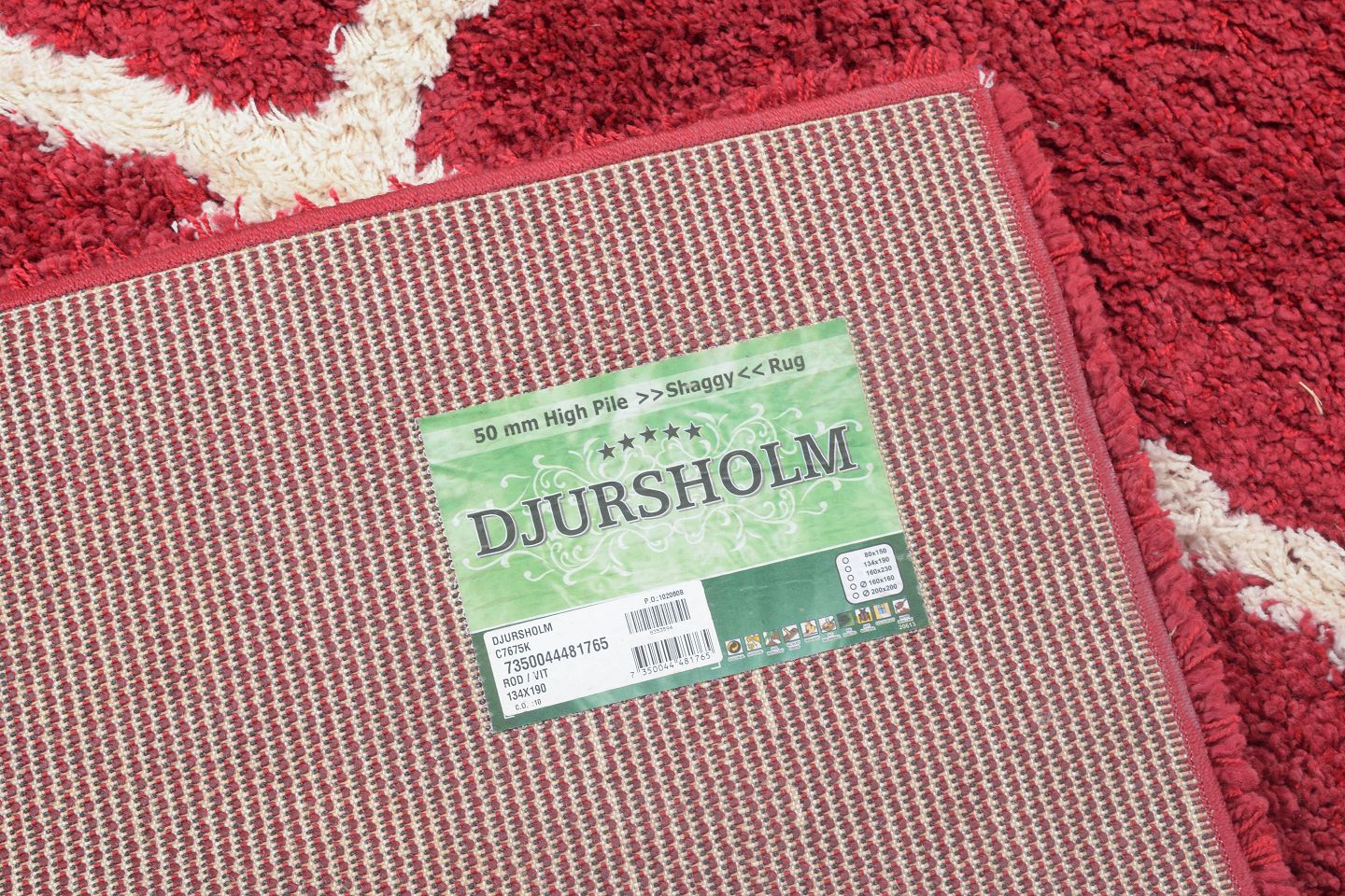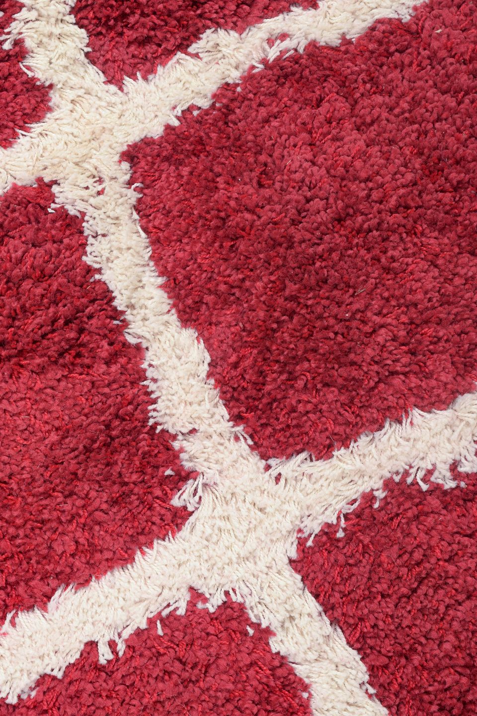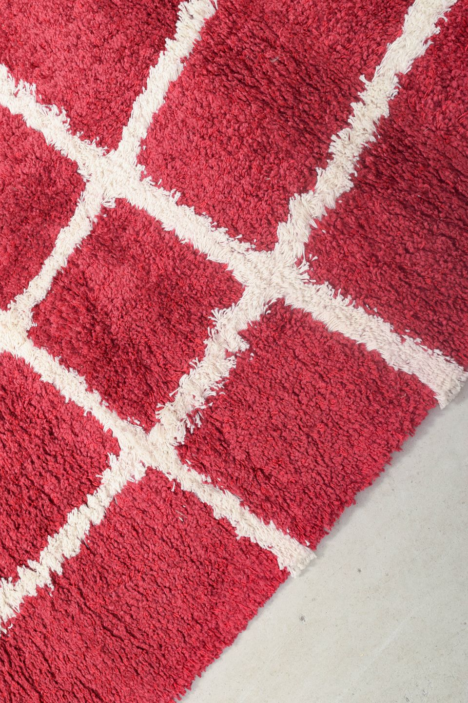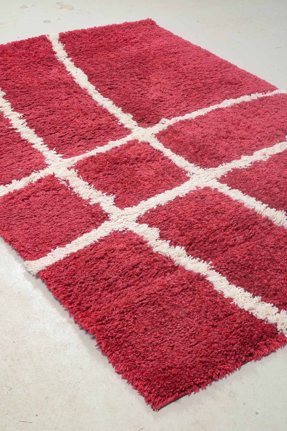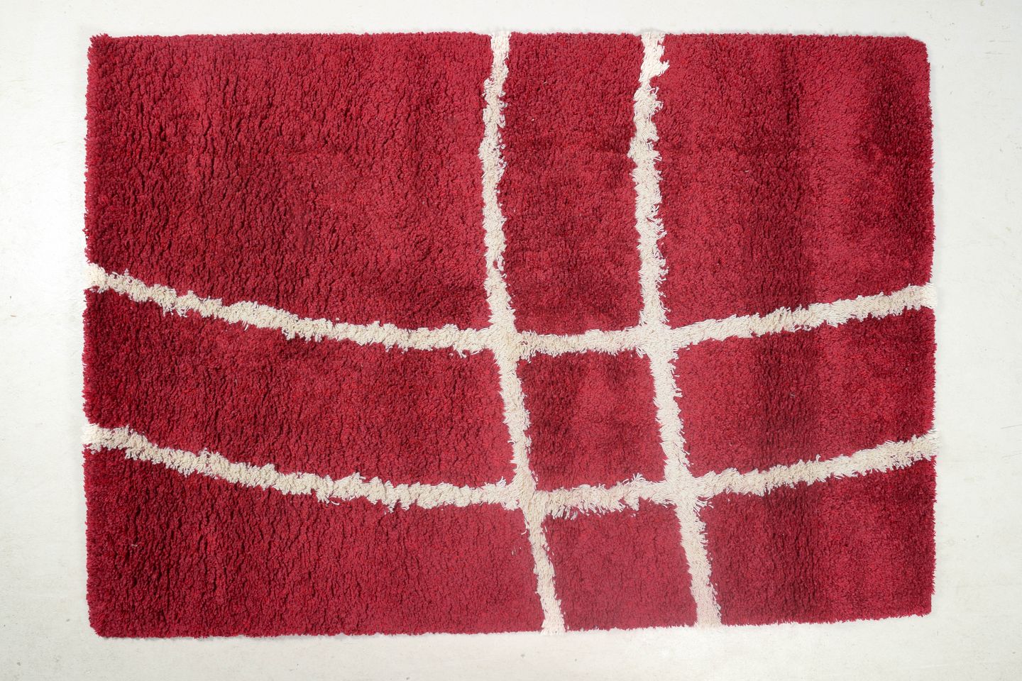 Rya-tæppe i bomuld med geometrisk mønster i røde og hvide nuancer. Et klassisk eksempel på skandinavisk tekstildesign fra perioden, hvor varme farver og modernistiske mønstre spillede en central rolle i boligindretningen.