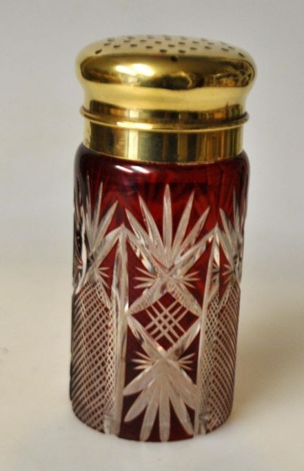 Antik bømisk sukker strøbøsse, 19. årh. Krystal med messing låg. H.: 12 cm.Emne nummer: 28498