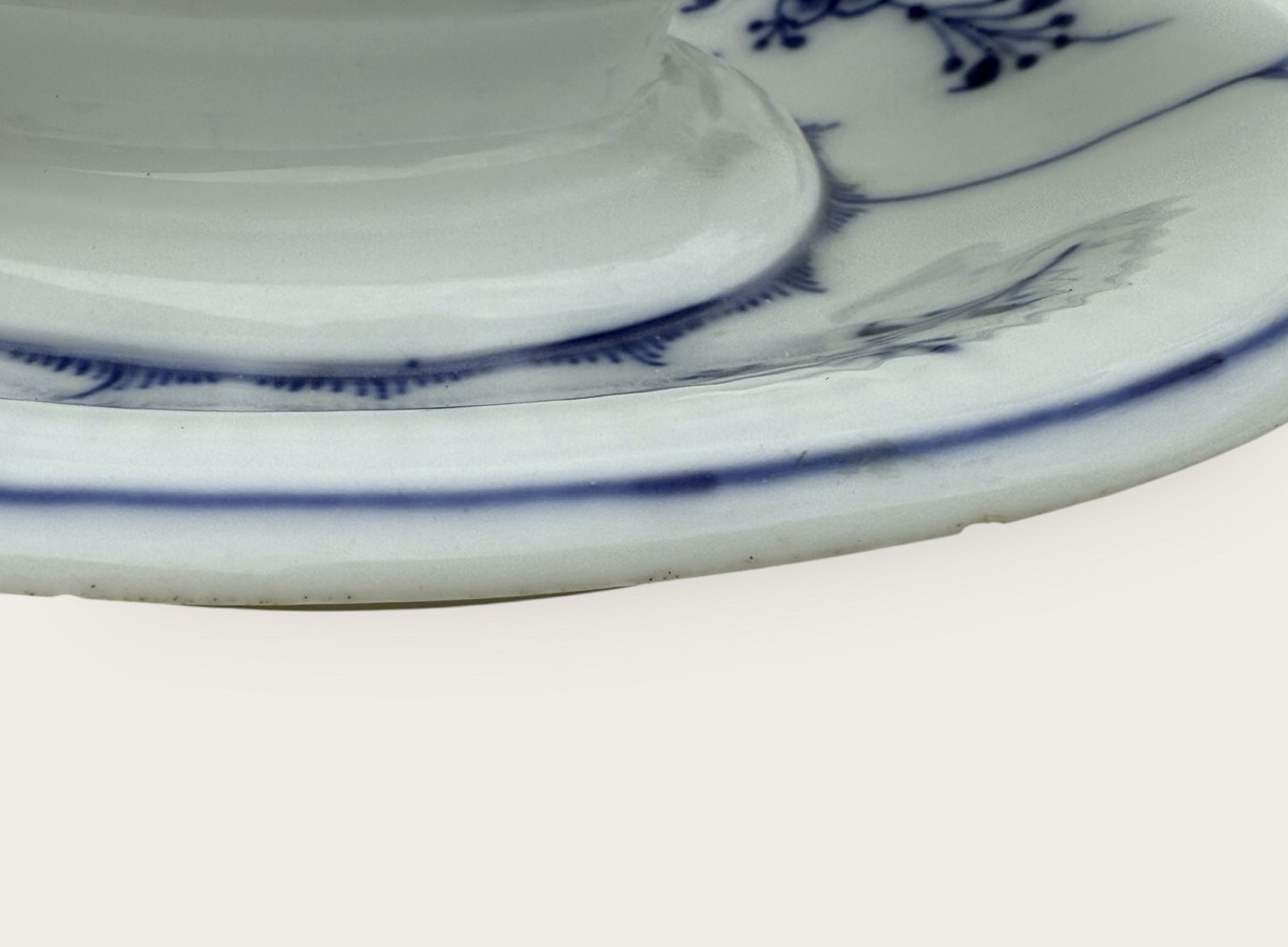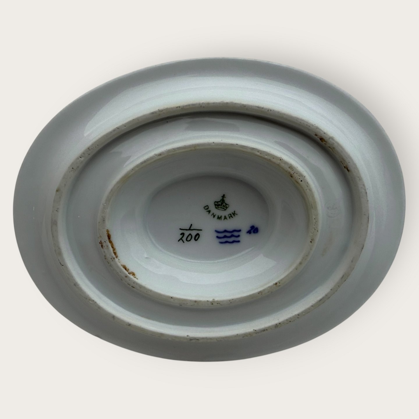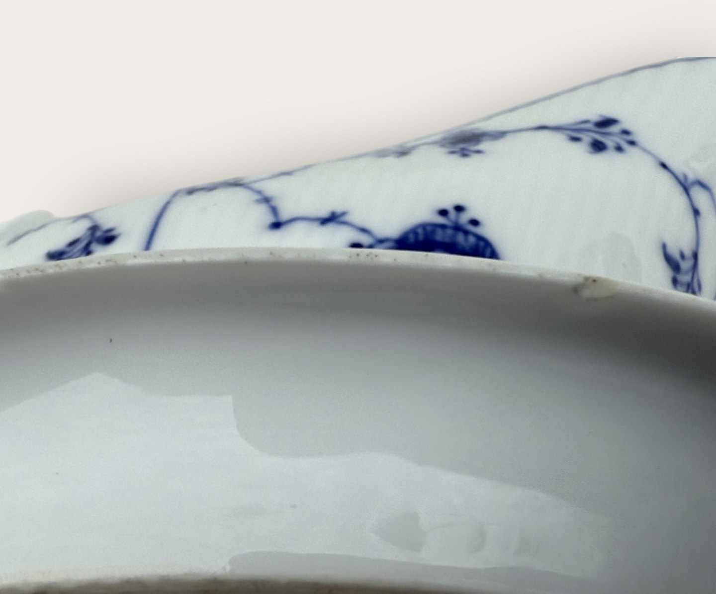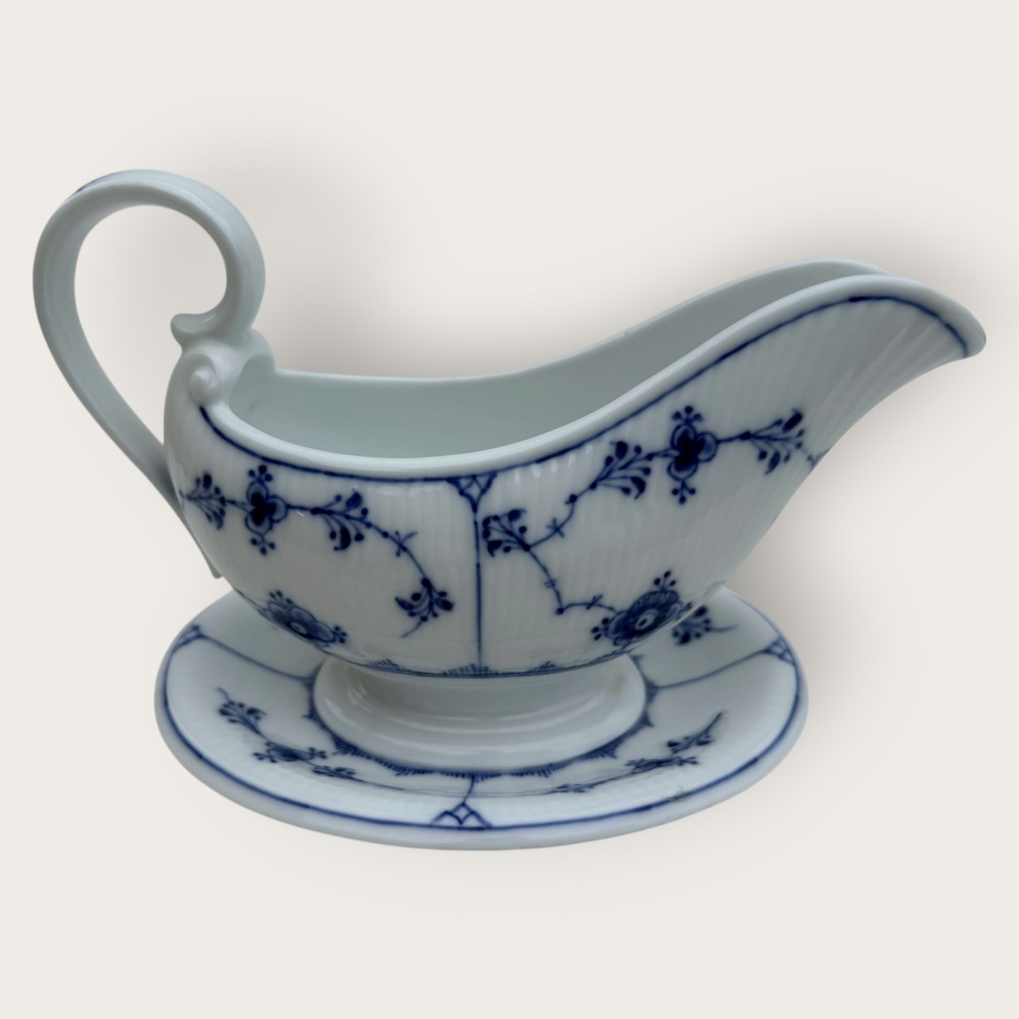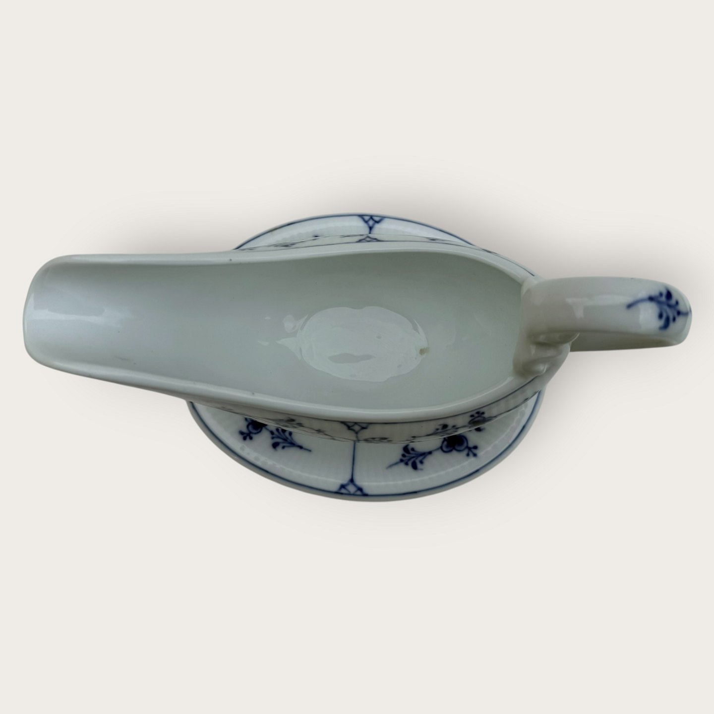 Royal Copenhagen, Musselmalet sovsekande på fast fod, # 1/200, Mål ca. HxBxD 10x20x13cm, Produceret mellem 1894 og 1900 * Med 2 meget små afslag under fodranden (se sidst 2 fotos) ellers pæn brugt standLager: 1
