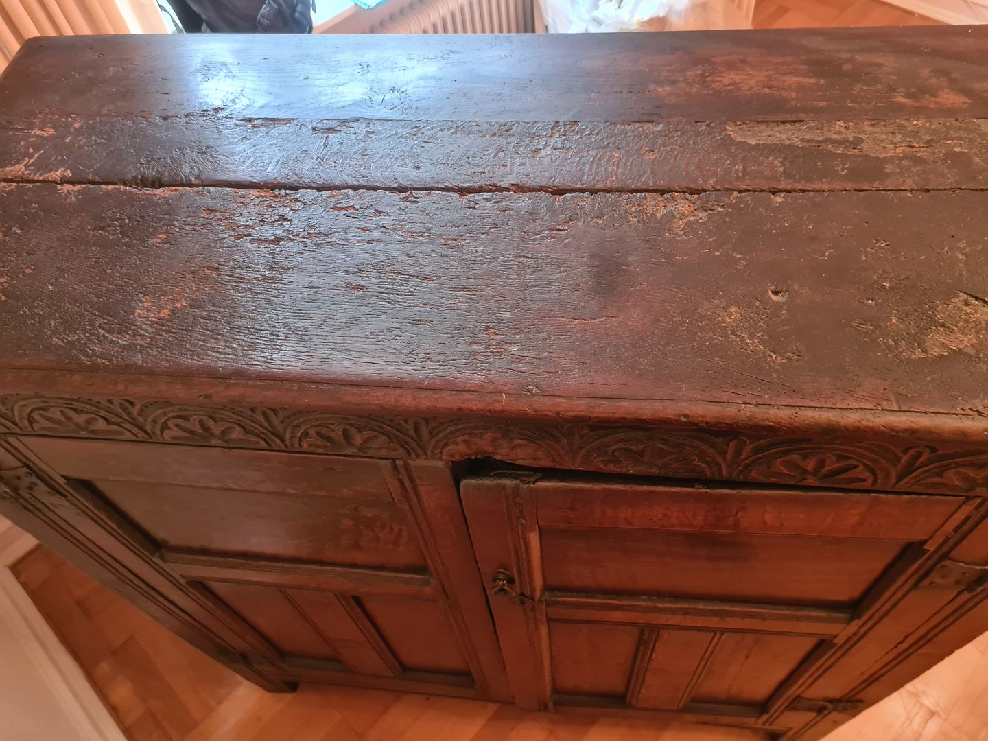 Antikt dækketøjsskab fra starten af 1800 tallet i eg. Fremstår godt og solidt med aldersrelaterede brugsspor på toppen.(billede) Umiddelbart uden nøgle.Højde 135 cm. Bredde 127 cm. Dybde 54 cm.