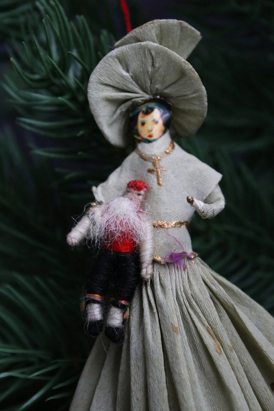 Gammelt juletræspynt , fin dame der holder en lille julemands dukke ,lavet i farvet krep papir. H: 15cm.