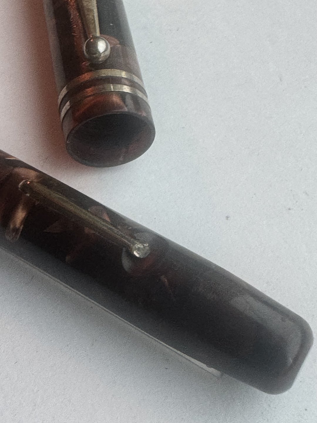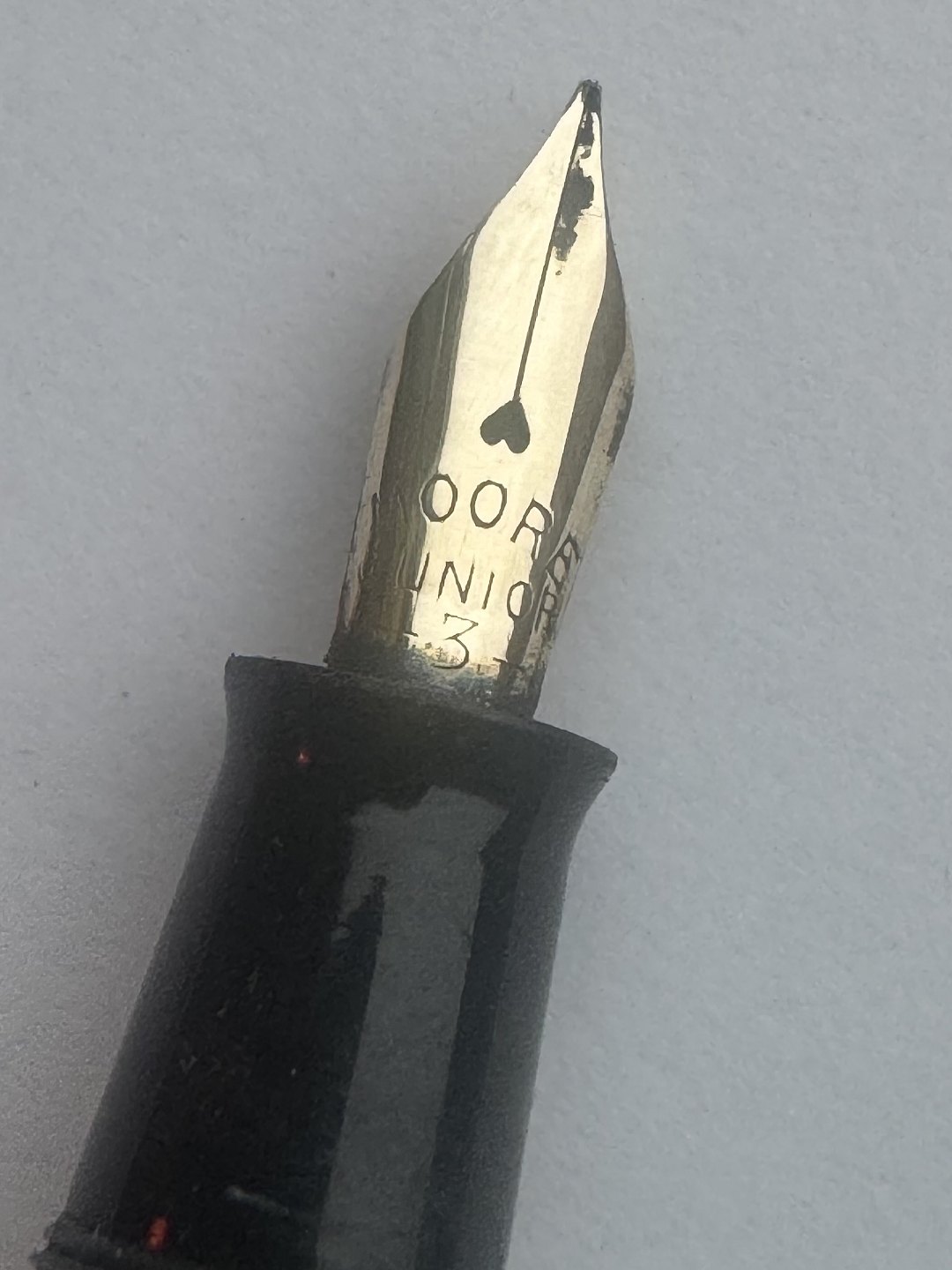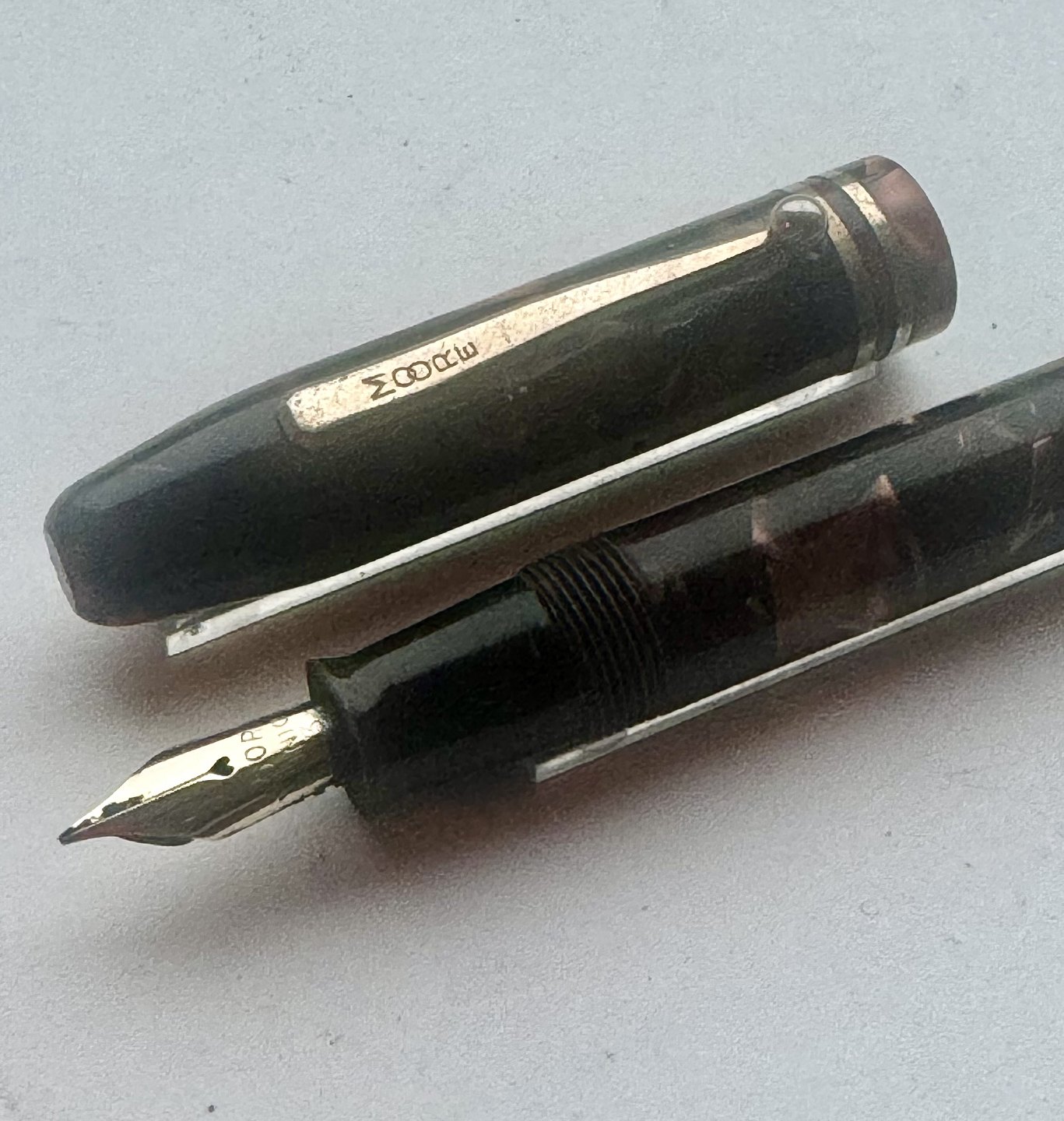 Grøn marmoreret fyldepen med lever filler fra The Moore Pen Company. Fremstillet i U.S.A. omkring 1940. Fungerer ikke. Der skal indsættes ny gummisæk før end den igen kan optage blæk og skrive igen. Fyldepennen fremstår ellers i god stand uden skader eller reparationer. Alle dele originale og fra den oprindelige periode.Ny gummisæk kan indsættes mod ekstra betaling på kr. 250,-