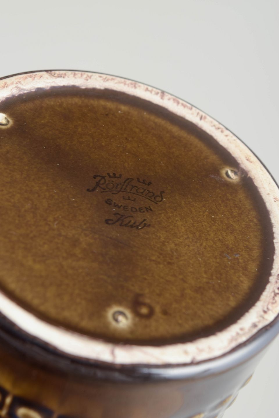 Cylinderformet vase i stentøj med karakteristisk reliefmønster af kvadratiske felter og brun glasur med gyldne nuancer. Et klassisk eksempel på Nylunds moderne formsprog fra 1960’erne.