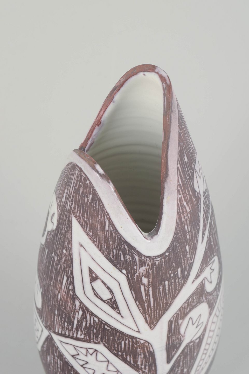 Håndlavet keramisk vase med markant asymmetrisk form og dekor i indridset grafisk mønster under brun og hvid glasur. Et karakteristisk eksempel på svensk studiokeramik fra 1960’erne med tydelig kunstnerisk signatur.