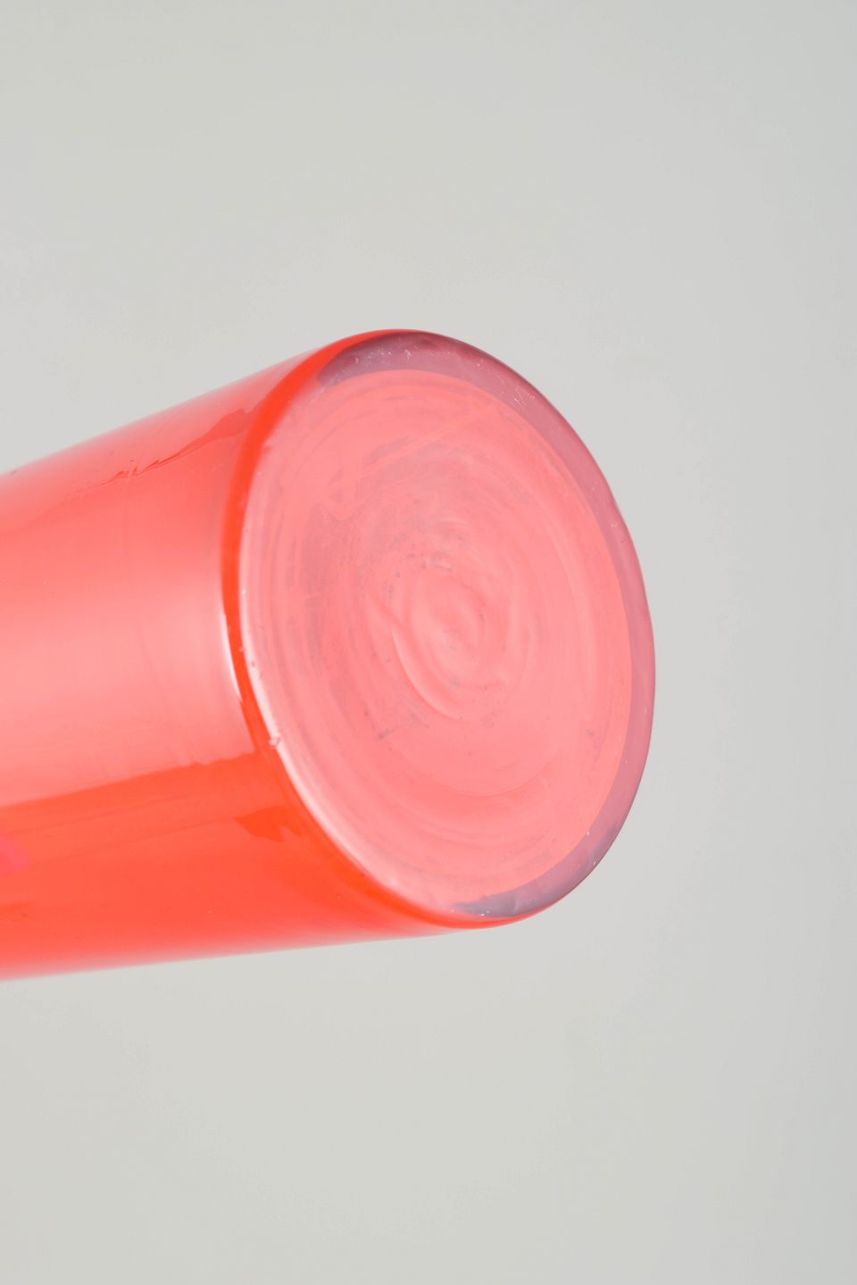 Elegant, mundblæst vase i klart orange glas med slank, cylindrisk form. Et tidstypisk eksempel på svensk glaskunst fra 1970’erne, hvor rene linjer og stærke farver spillede en central rolle i designudtrykket.