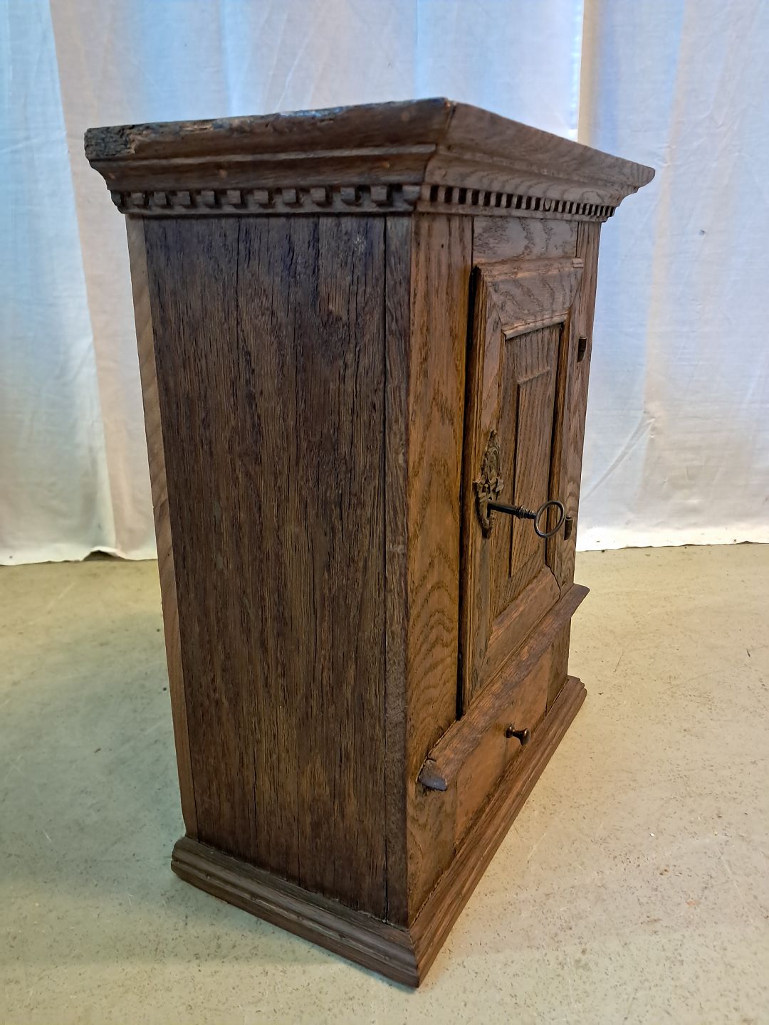 Vægskab i massivt egetræ, fra 1870erne.Det har brugsspor.