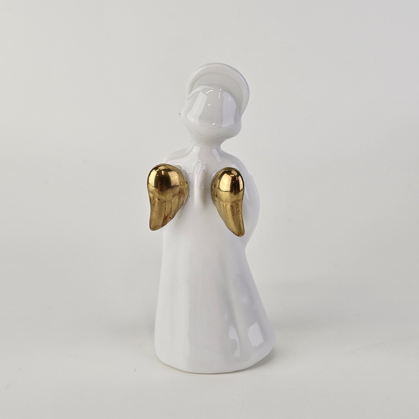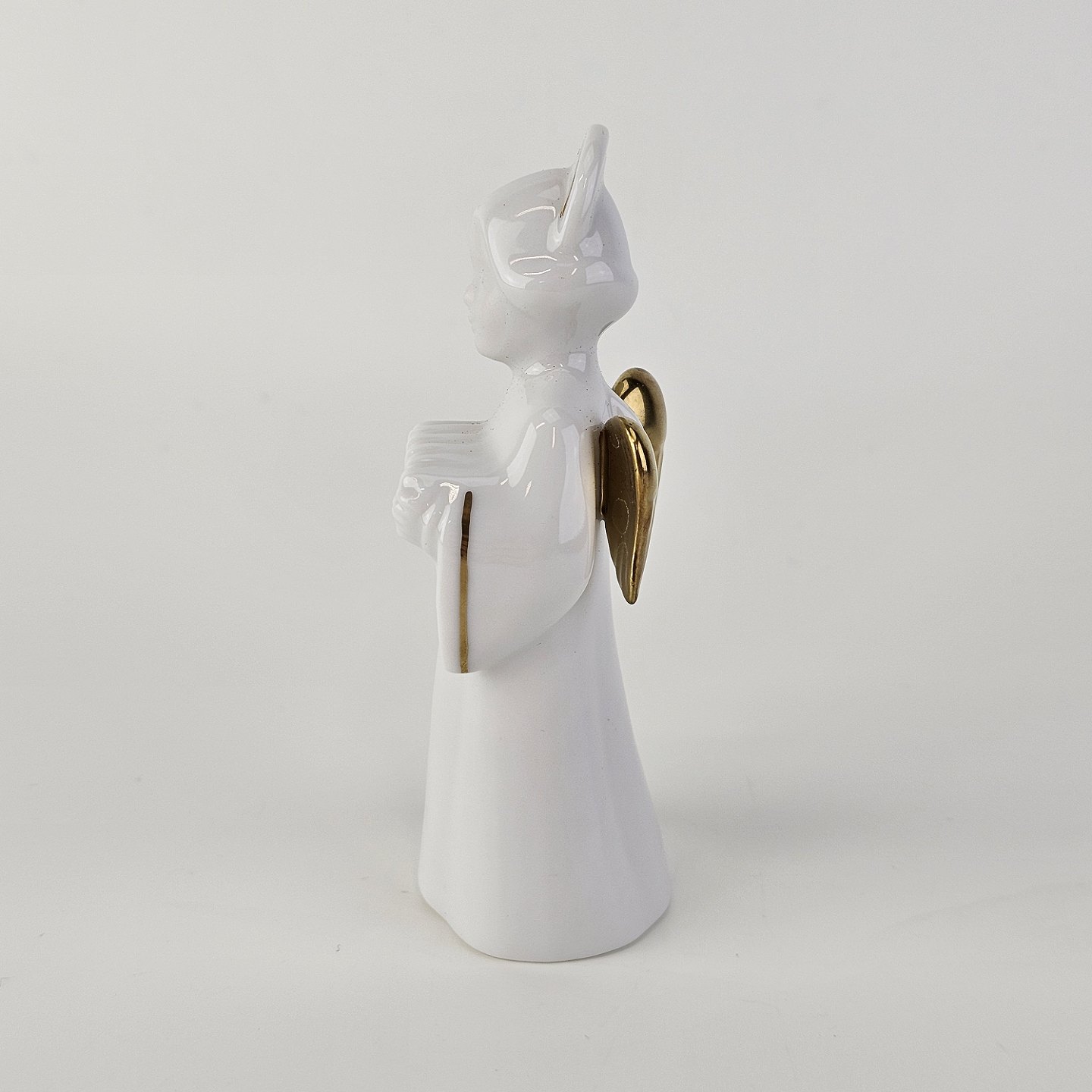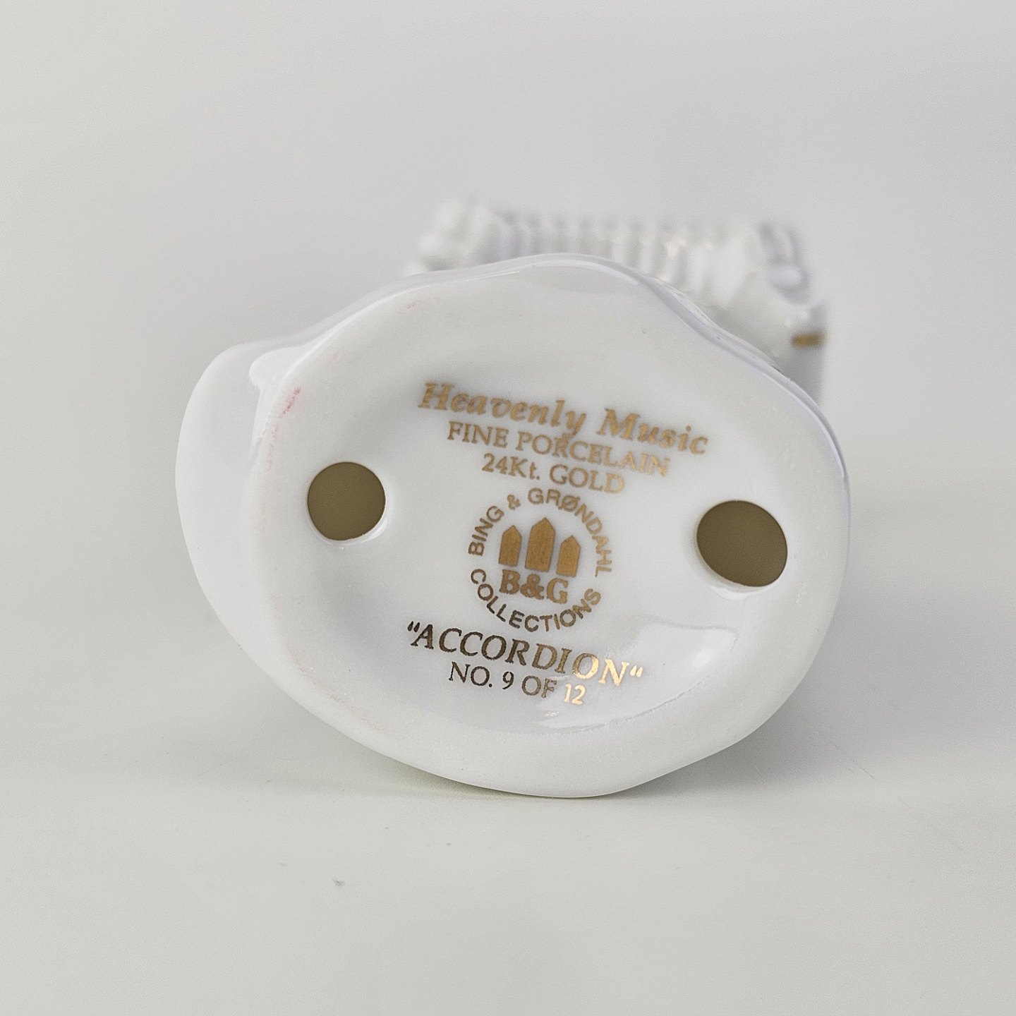 Figur med motiv af en engel som spiller på harmonika. Figuren er i hvidt porcelæn med forgyldte vinger og detaljer i 24 karat guld.9 af 12 i serien Heavenly Music med titlen Accordion