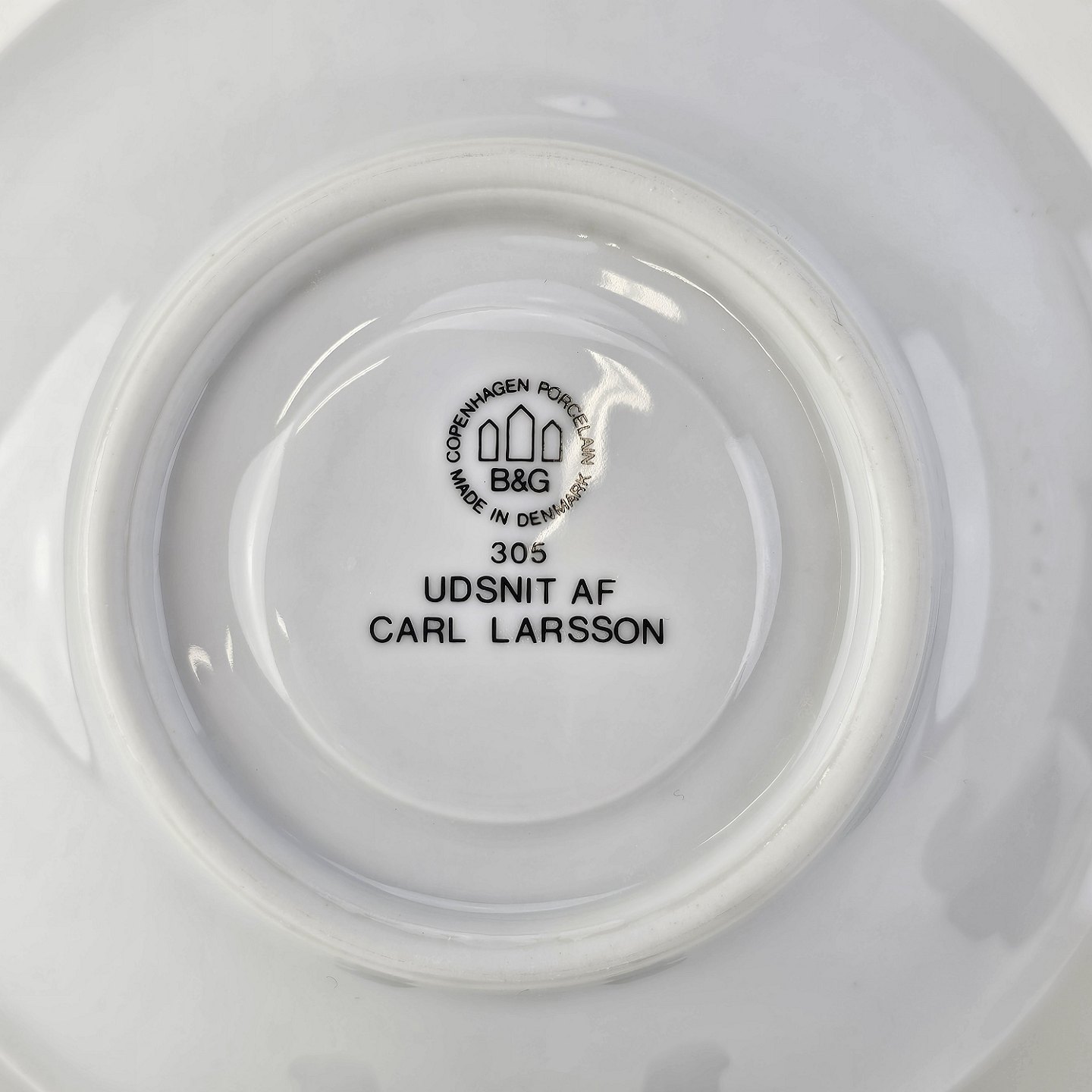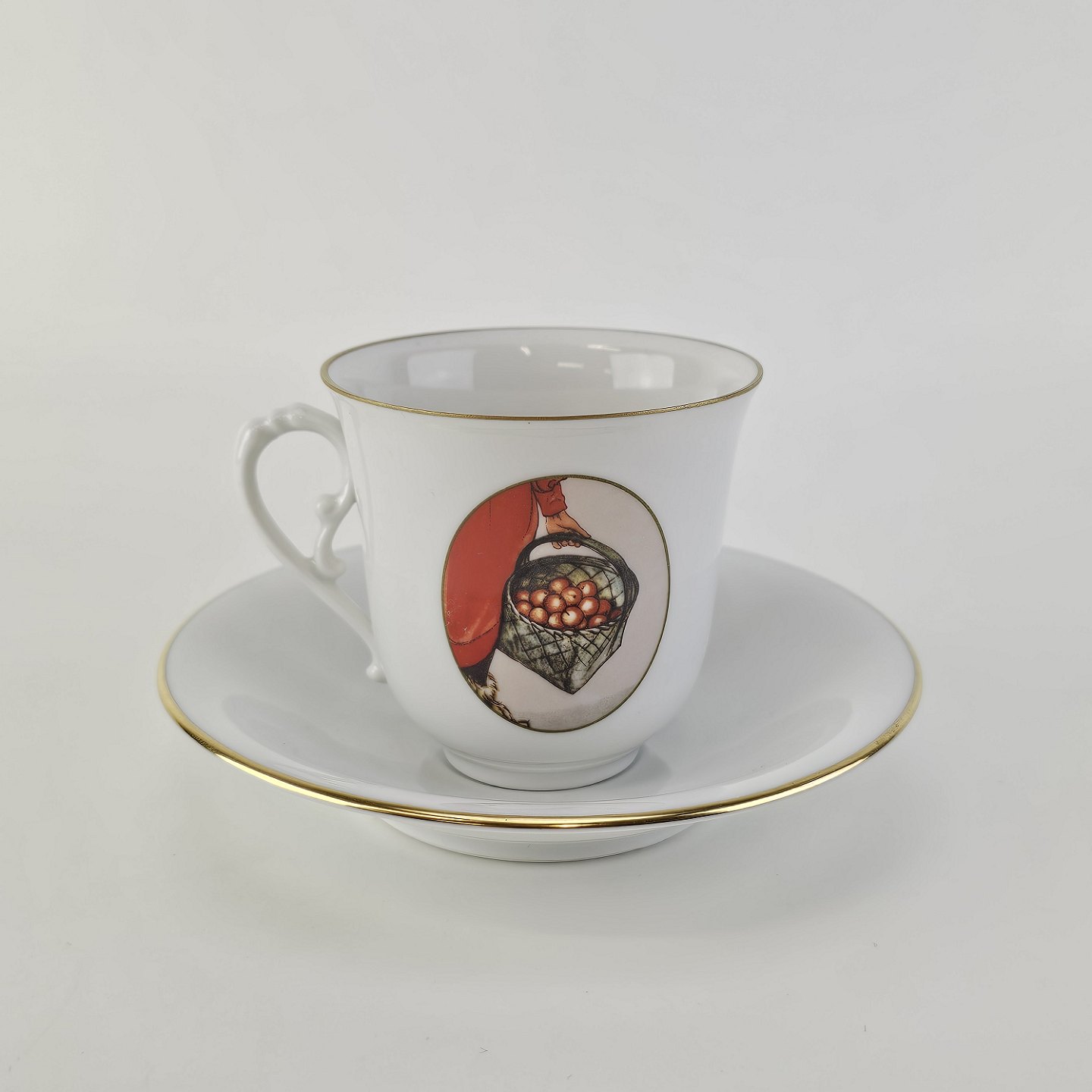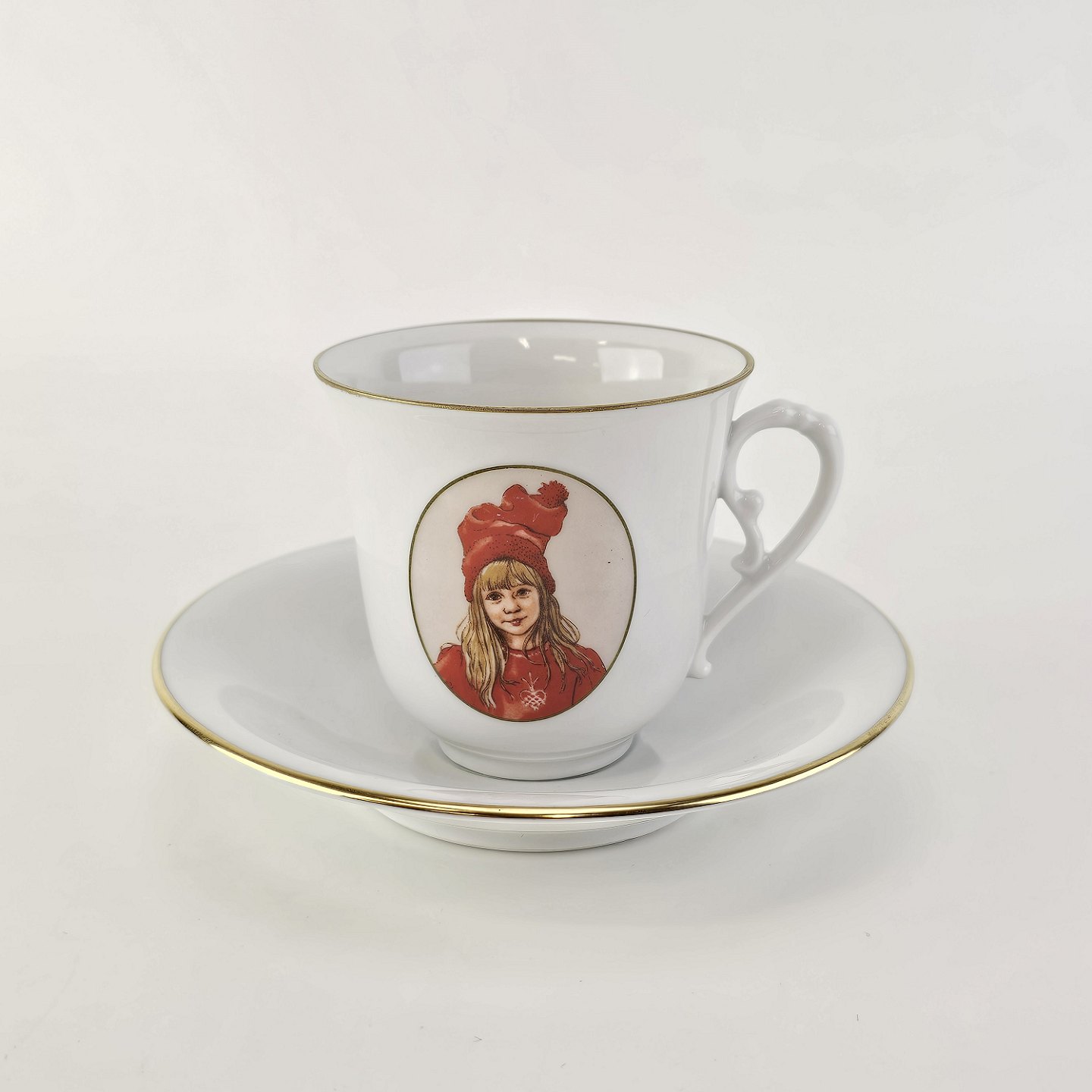 Kop med underkop i porcelæn med guldkant og platte i porcelæn med guldkant og udsnit af Carl Larsson malt 1900, fra Carl Larsson kaffestellet.