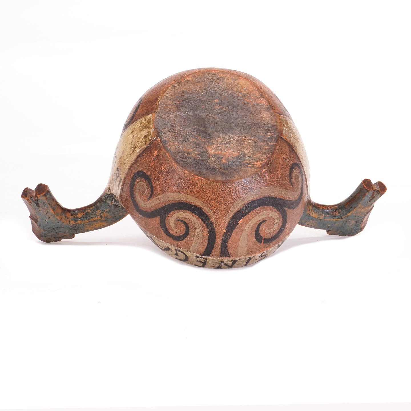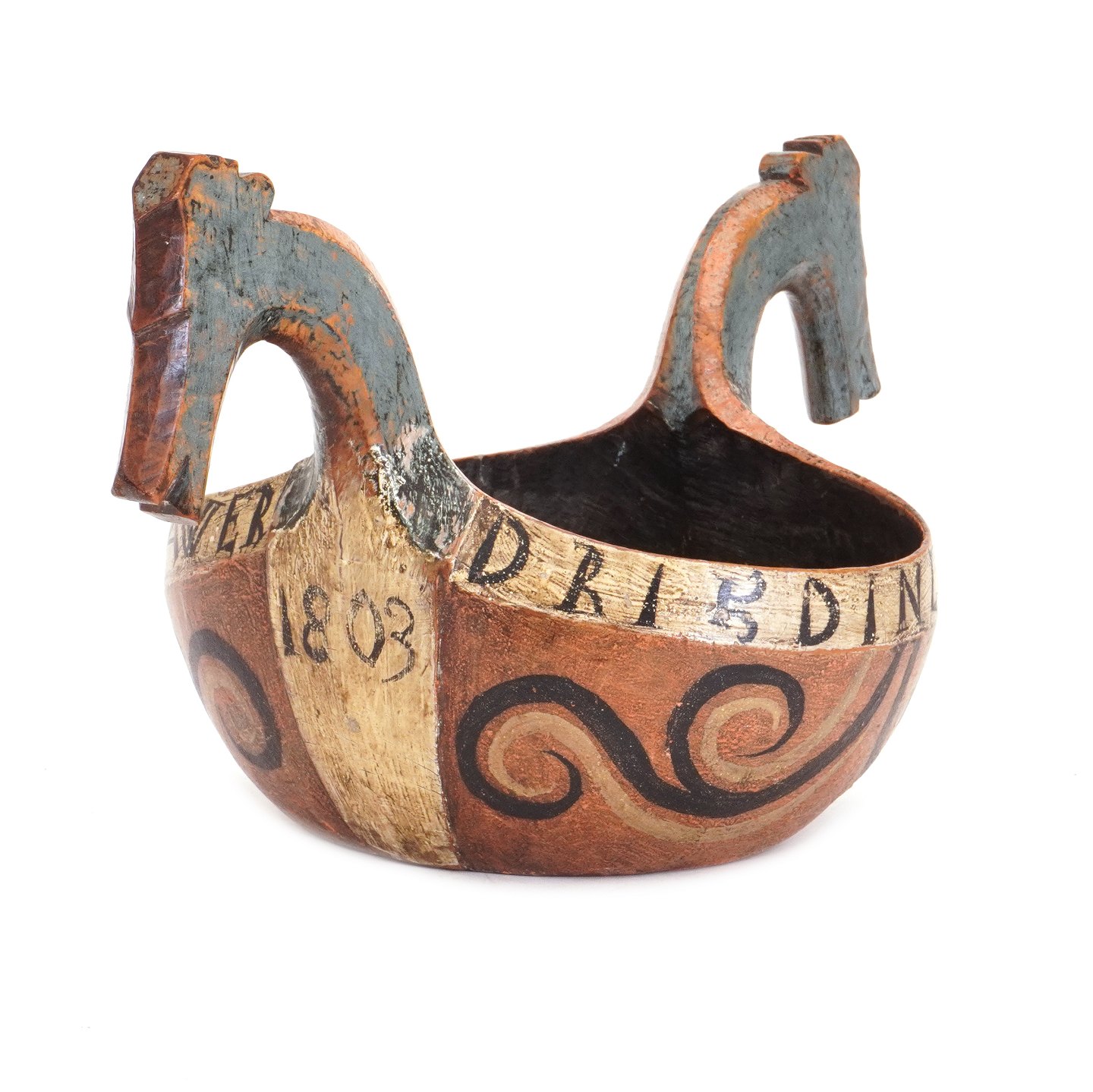 Norsk originaldekoreret ølbolle udskåret i træ med hanke i form af hestehovederDateret 1803. Sider med drikkevise