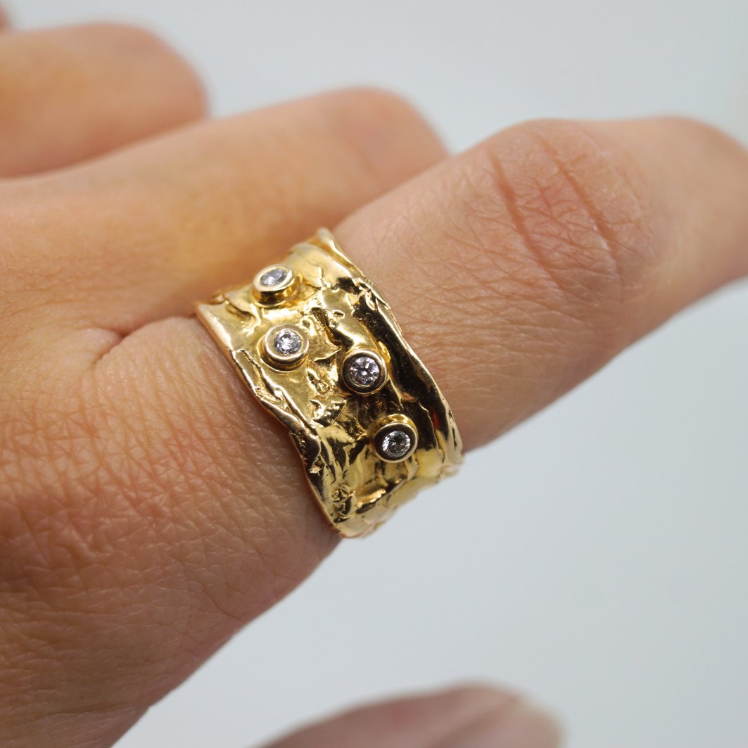 Henning Skovgaard; Bred ring i 14 kt. guld, prydet med fire diamanter, i alt 0.20 ct. Ring str. 53. Stemplet "585 GIG".Henning Skovgaard, guldsmed Glamsbjerg, est. 1994.