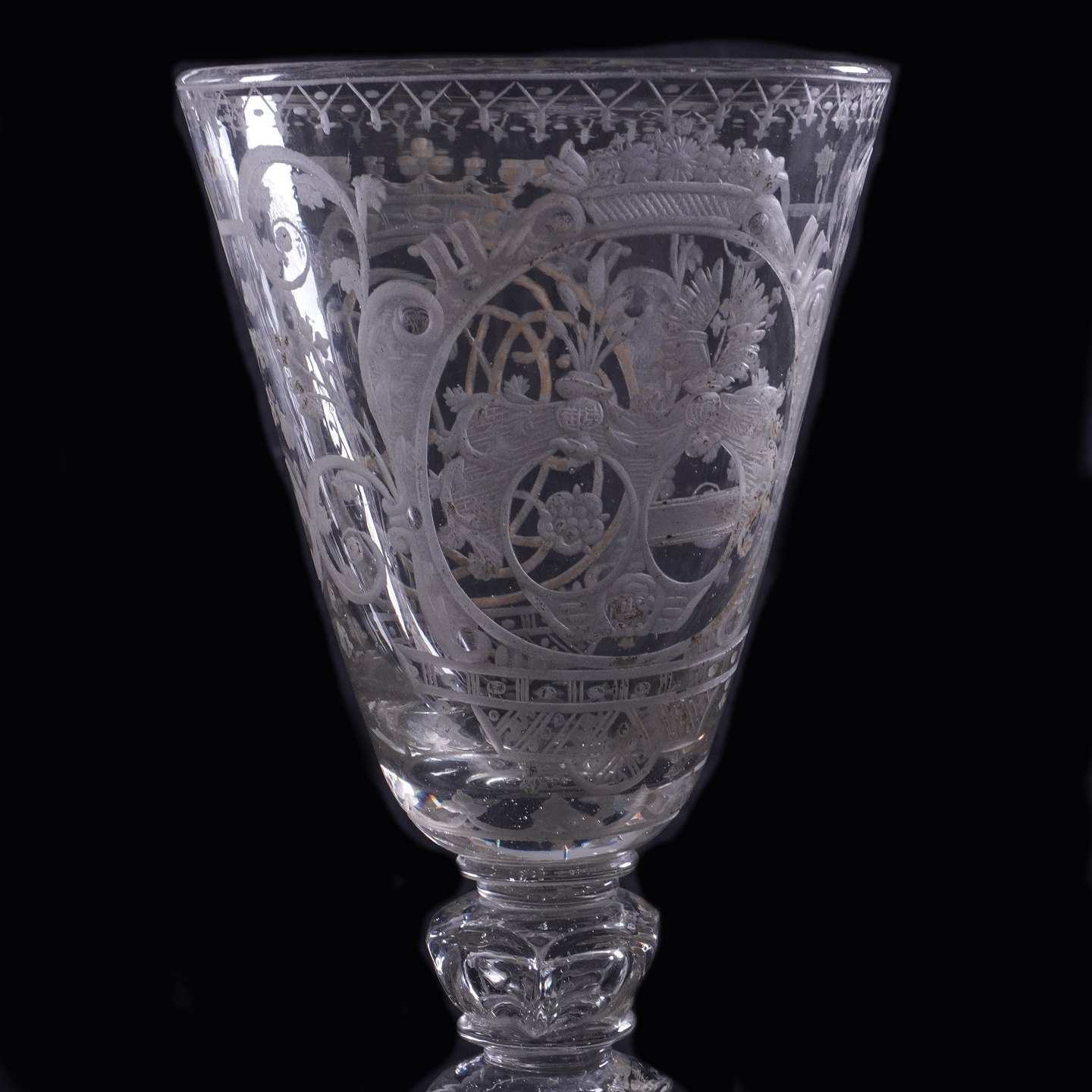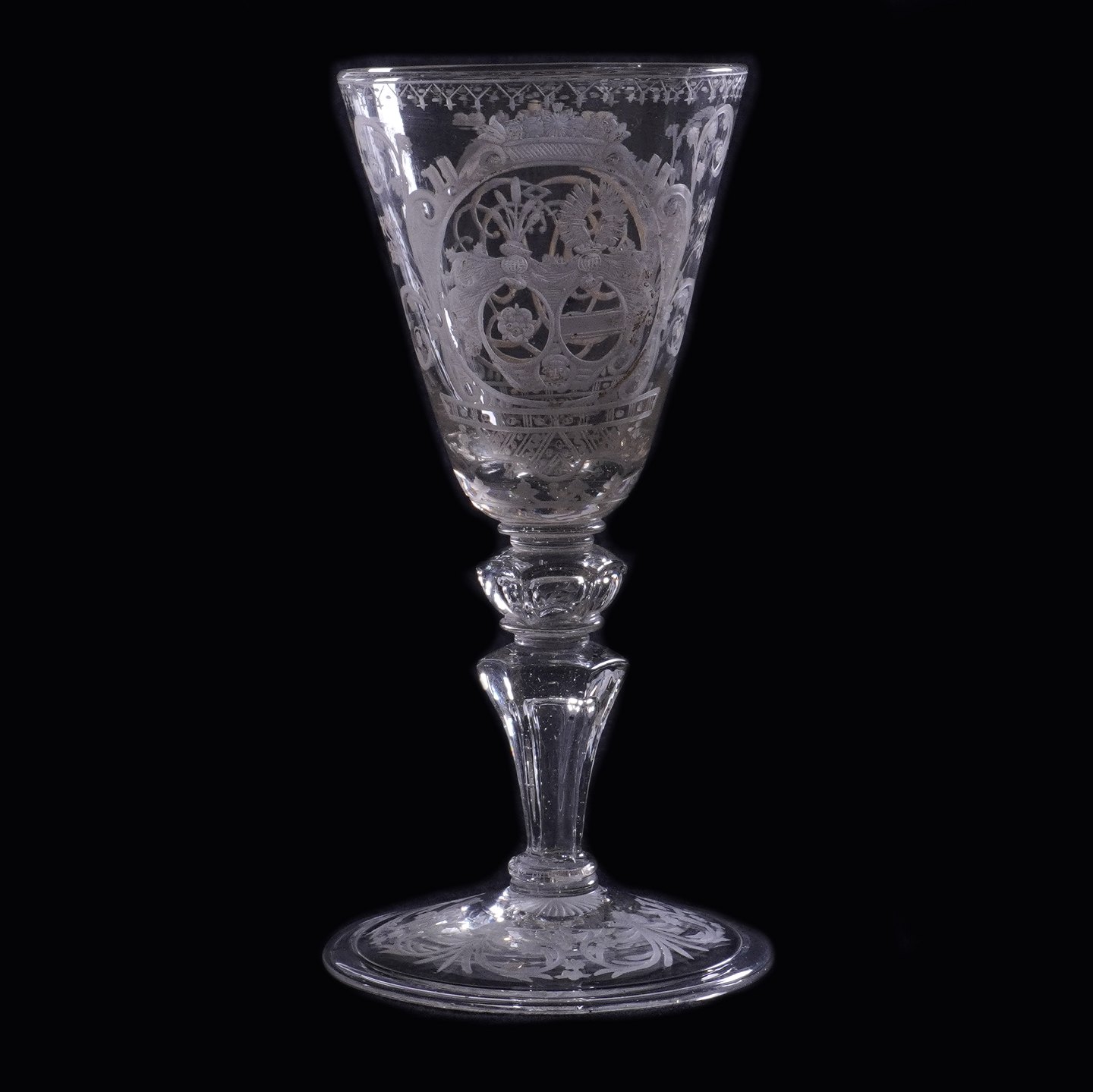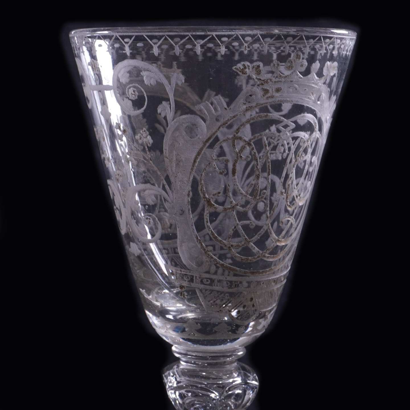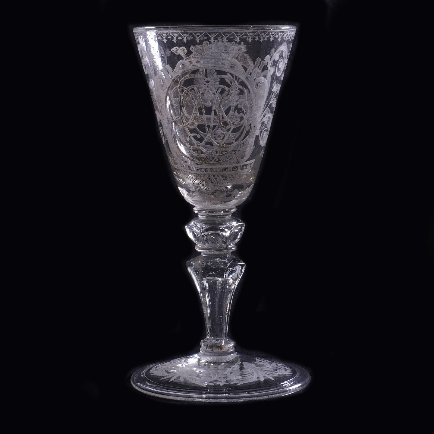 Glaspokal med kronet spejlmonogram og alliancevåben. Thürringen ca. år 1750. H: 19,5cm