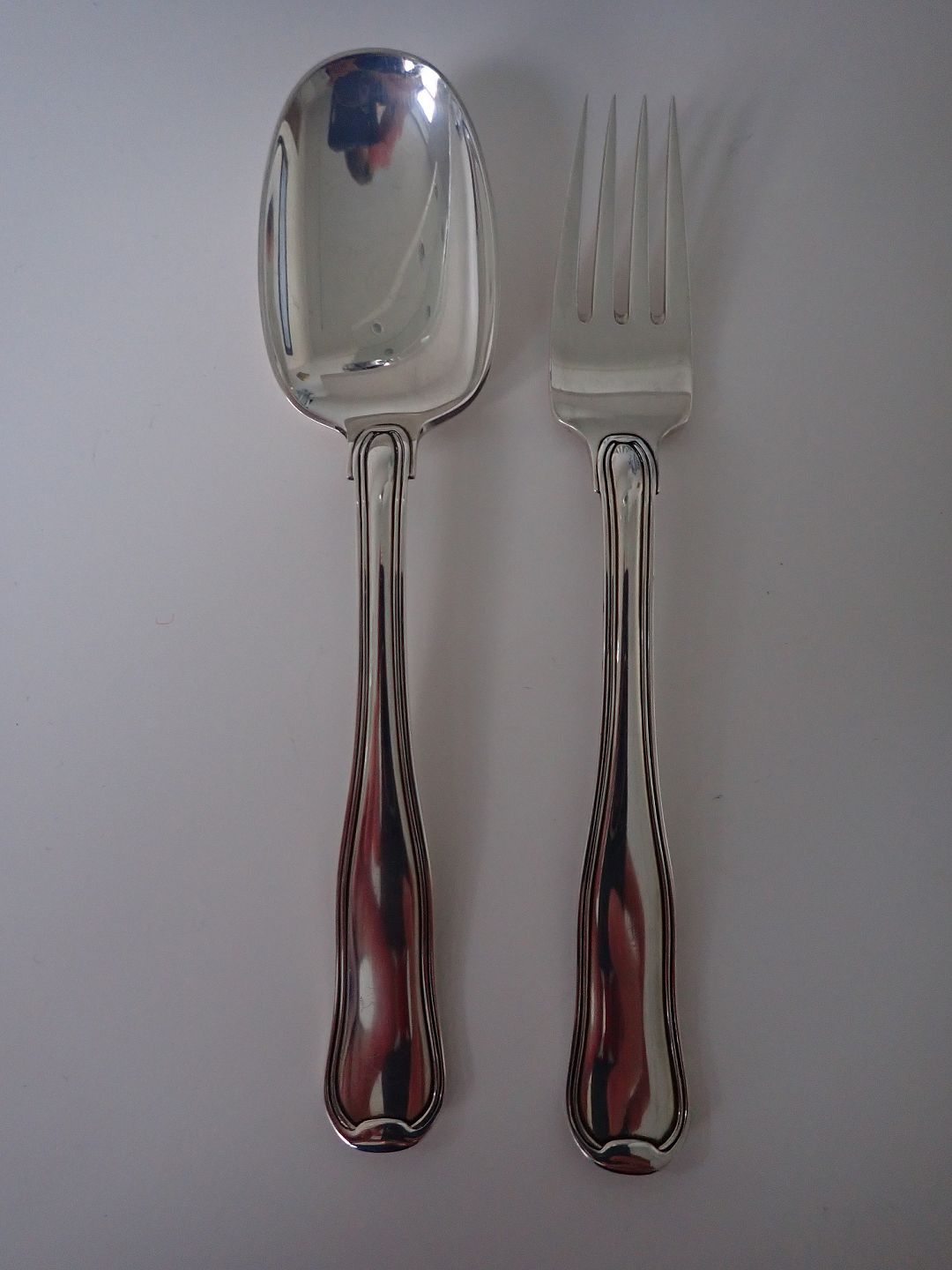 Georg Jensen -dobbeltriflet barnesæt med ske og gaffel i sterling sølv. Efter 1945. Samlet vægt: 79,5 gram. Længde på ske: 15,4 cm. Længde på gaffel 15,2 cm. I fin nærmest ubrugt stand. Udstiller