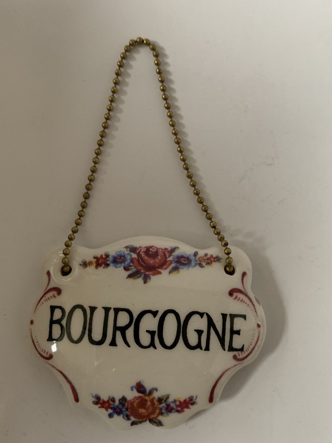 Flaske / Karaffel Bourgogne skilt med kædeStørrelse 7 x 5,5 cm.