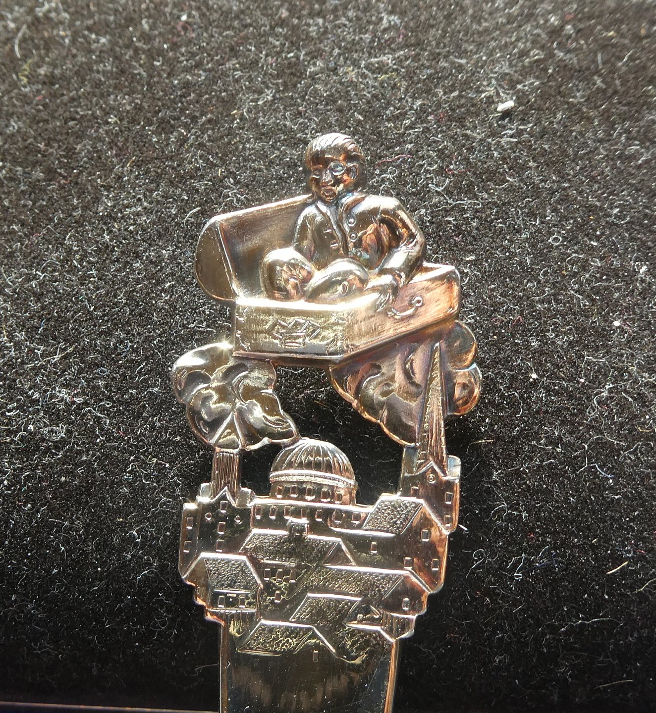 H.C. Andersen barnebestik i forgyldt tretårnet sølv med Den flyvende Kuffert.H.C. Andersen eventyr børnebestik.