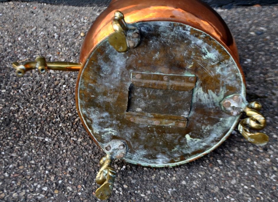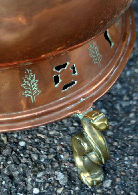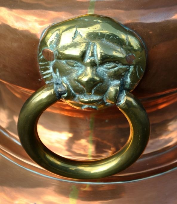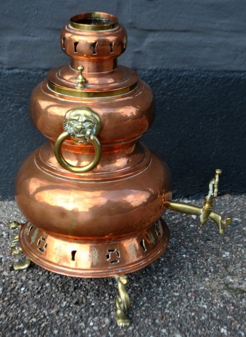 Themaskine i kobber, barok, 18. årh. Danmark. Ben, håndtag og tappehane af messing. Dekoreret med løvehoved og løvefødder. Indvendig fortinnet. H: 41 cm. Dia: 23,5 cm.Emne nummer: 28361